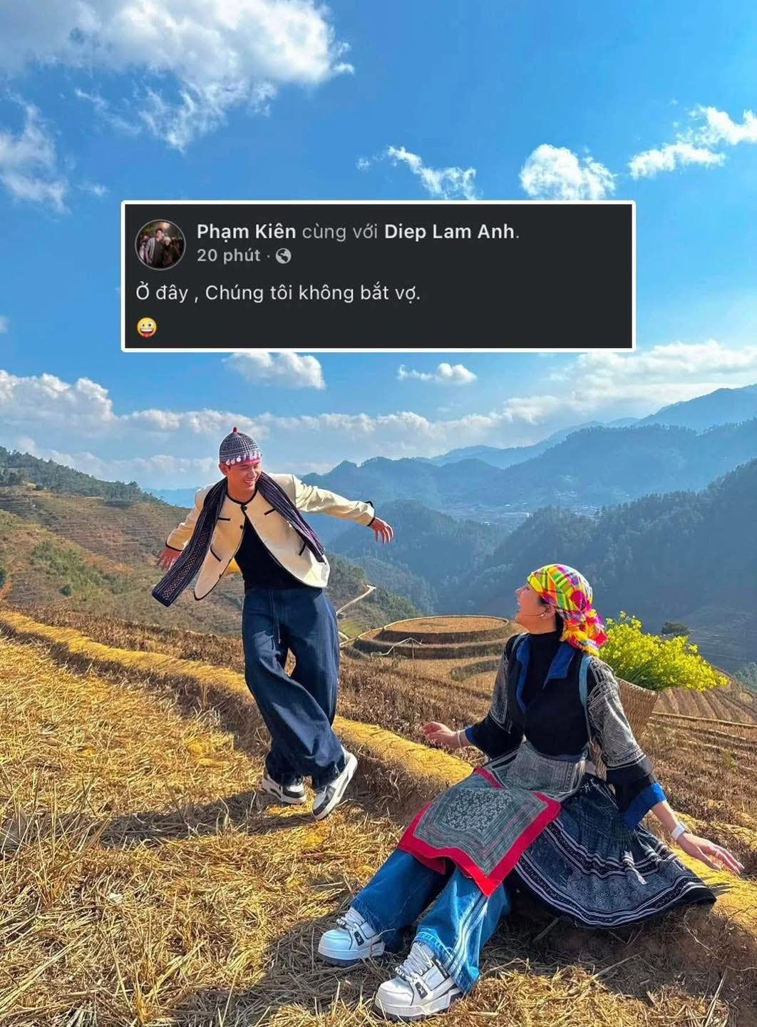 Nhân ngày Valentine, Phạm Kiên đăng tải hình ảnh chụp cùng Diệp Lâm Anh với chú thích: "Ở đây, chúng tôi không bắt vợ". Cặp đôi mặc trang phục dân tộc, check-in tại Mù Cang Chải. Nam người mẫu tạo dáng nhảy Hip-Hop, trong khi "chị đẹp" cười rạng rỡ. Kể từ khi nghi vấn hẹn hò bùng nổ, đây là lần đầu tiên mỹ nam 25 tuổi đăng tải hình ảnh sánh đôi cùng "bạn gái tin đồn" trên trang Facebook cá nhân.