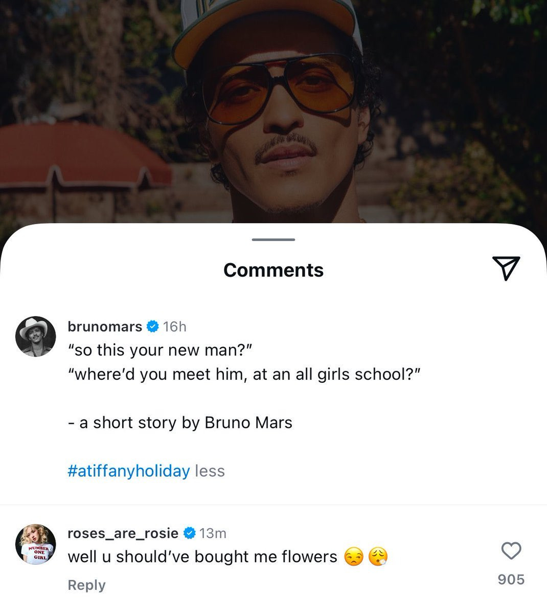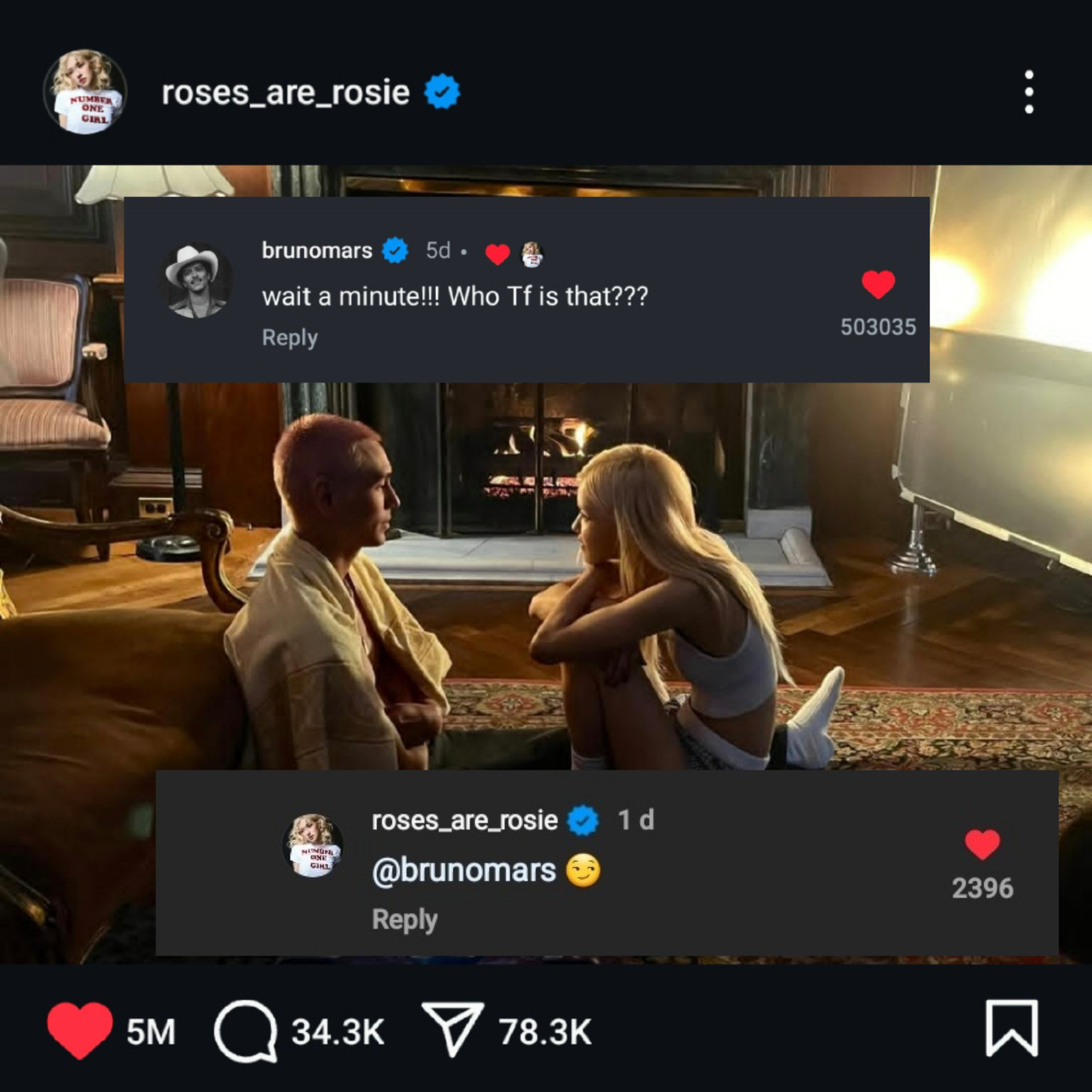 Không để fan đợi lâu, Rosé đã nhập cuộc khi để lại một bình luận dưới bài đăng của Bruno Mars: "Well u should’ve bought me flowers" (Thế thì đáng ra anh phải mua hoa cho em chứ", được cho là "nhại lại" lời bài hát When I Was Your Man (dịch: Khi anh là người đàn ông của em).
