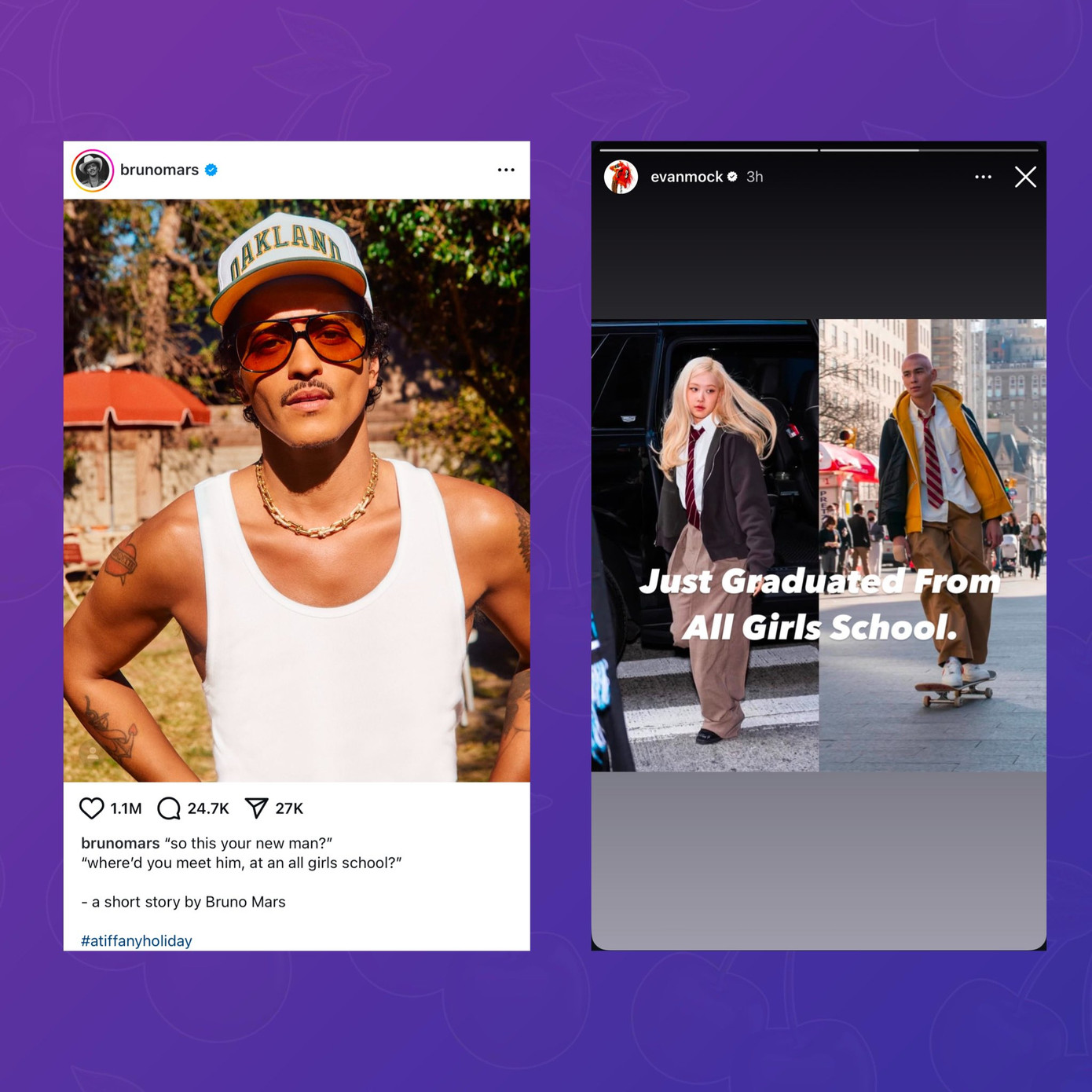 Không lâu sau bài đăng của Bruno Mars, Evan Mock đã đăng một Story Instagram ghép ảnh của bản thân - thời điểm đóng Gossip Girl và Rosé mặc đồ tương tự nhau. Evan viết: "Just graduated from all girls school" (vừa tốt nghiệp trường nữ sinh).