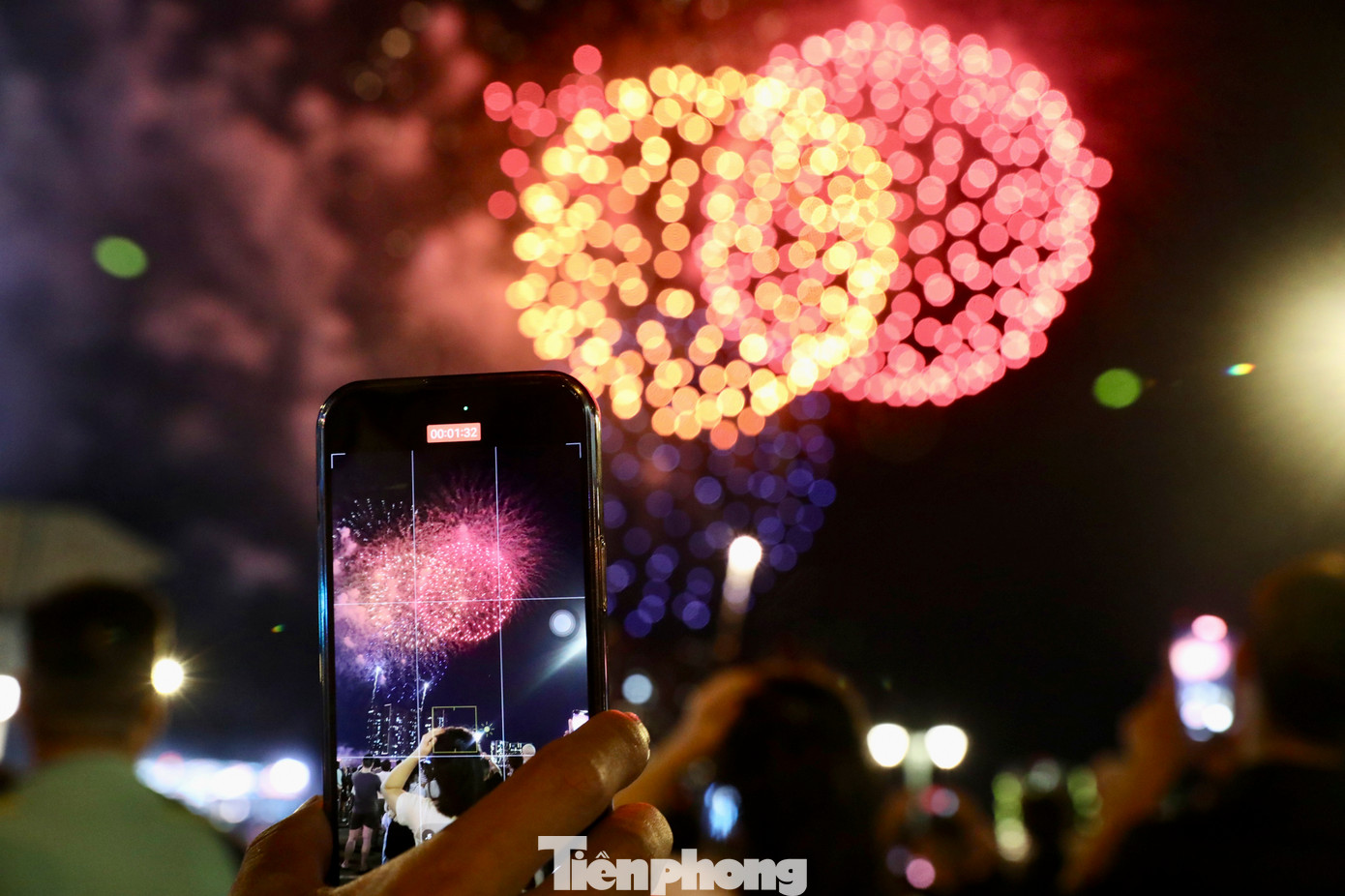 | Nhiều bạn trẻ dùng điện thoại để lưu lại hình ảnh những chùm pháo hoa nhiều màu sắc. |