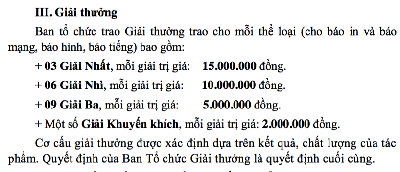 Các tác phẩm thuộc tất cả các loại hình báo chí hợp pháp được đăng tải từ ngày 1/6/2020 đến ngày 30/5/2021, có nội dung phù hợp với tiêu chí Giải thưởng.