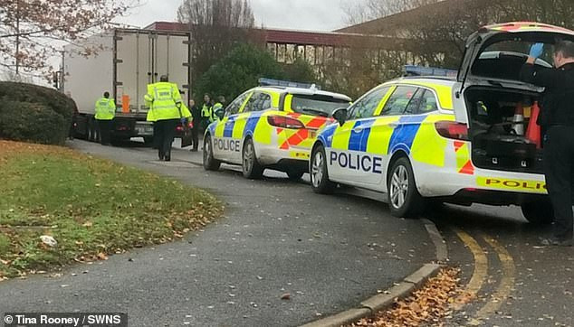 Cảnh sát bao vây chiếc xe tải chở đoàn người nghi nhập cư. Ảnh: Tina