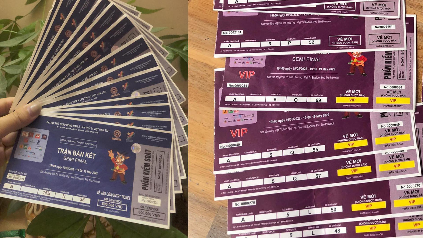 Trận bán kết môn bóng đá nam SEA Games 31 giữa Việt Nam và Malaysia sẽ diễn ra trên sân Việt Trì vào lúc 19h ngày 19/5. Mức giá vé trận bán kết có 3 mệnh giá : 300.000 đồng, 400.000 đồng, 600.000 đồng/vé. Những tấm vé này đã bán sạch trên cả hệ thống online lẫn bán trực tiếp từ nhiều ngày trước.