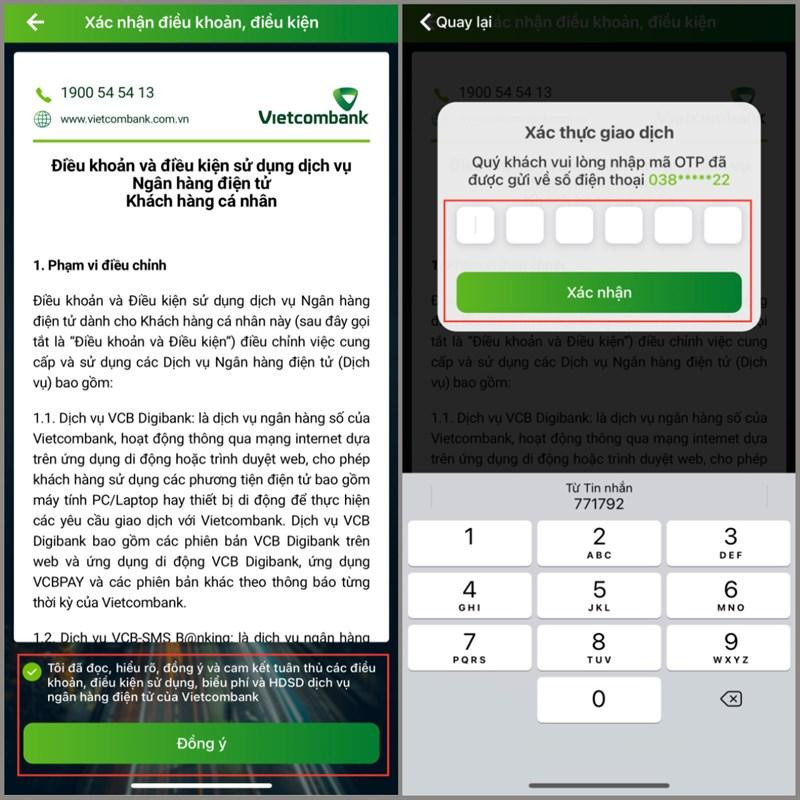 Bước 2: Tại phần Xác nhận điều khoản, điều kiện thì bạn nhấn nút “Tôi đã đọc…” và “Đồng ý” để xác nhận đăng ký dịch vụ. Kế tiếp, bạn nhập mã số OTP gửi về điện thoại bạn để xác nhận kích hoạt thành công dịch vụ.