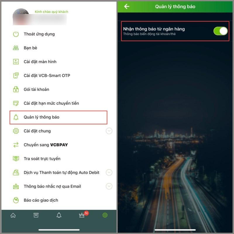 Bạn truy cập vào ứng dụng VCB Digibank, sau đó đăng nhập tài khoản của bạn. Bạn nhấn chọn Cài đặt, sau đó chọn Quản lý thông báo. Kế tiếp, bạn bật On tại mục Nhận thông báo từ ngân hàng.