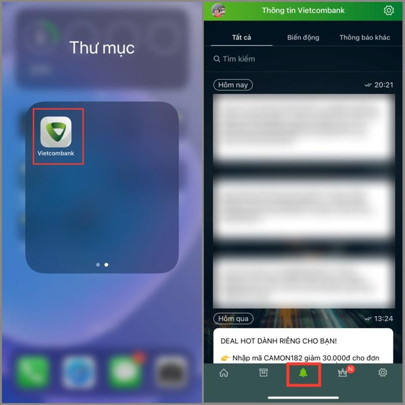 Bước 3: Bạn truy cập trở lại ứng dụng VCB Digibank, nhấn vào mục Thông báo (biểu tượng cái chuông) để xem các thông báo số dư nhé!