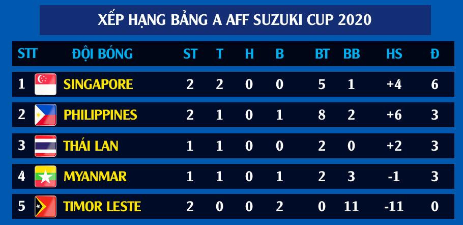 Với kết quả này, Philippines đã tạm thời vươn lên vị trí thứ 2 bảng A. Thầy trò Stewart Hall cùng có 3 điểm như Thái Lan và Myanmar nhưng xếp trên nhờ hơn hiệu số bàn thắng/bại.