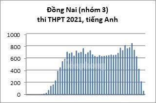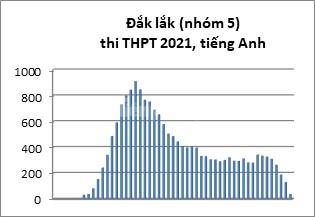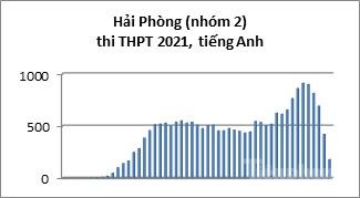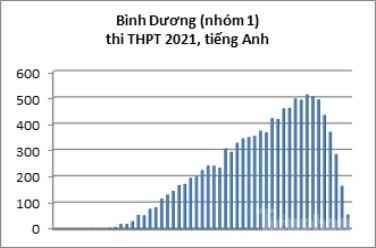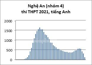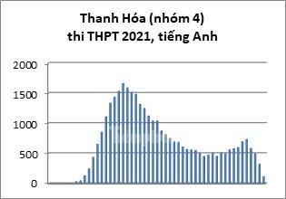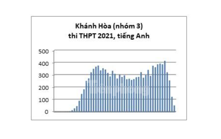 Nhóm 2: các tỉnh cũng có điểm cao (nhưng không cao bằng Nhóm 1), phổ điểm có 2 đỉnh trong đó đỉnh phải cao hơn đỉnh trái. Các tỉnh này môn tiếng Anh ngoài nhà trường phát triển tốt: