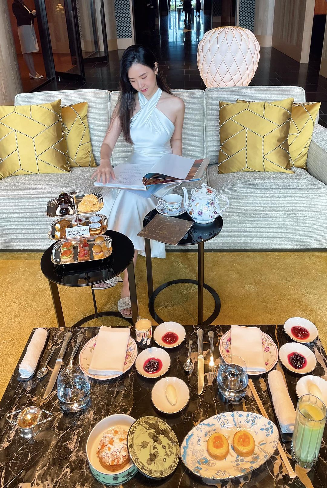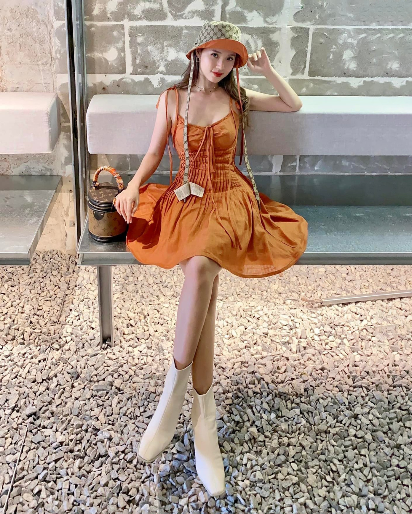 Sở hữu vóc dáng mảnh mai, nữ diễn viên chuộng các thiết kế khoe khéo bờ vai thanh mảnh. Cùng chồng dùng bữa, uống trà chiều, cô nổi bật trong thiết kế đầm hai dây tông màu cam đất. Midu cũng từng diện mẫu đầm này trong nhiều lần gặp gỡ bạn bè. So với thời điểm này, nhan sắc nàng dâu hào môn trông mặn mà, cuốn hút.