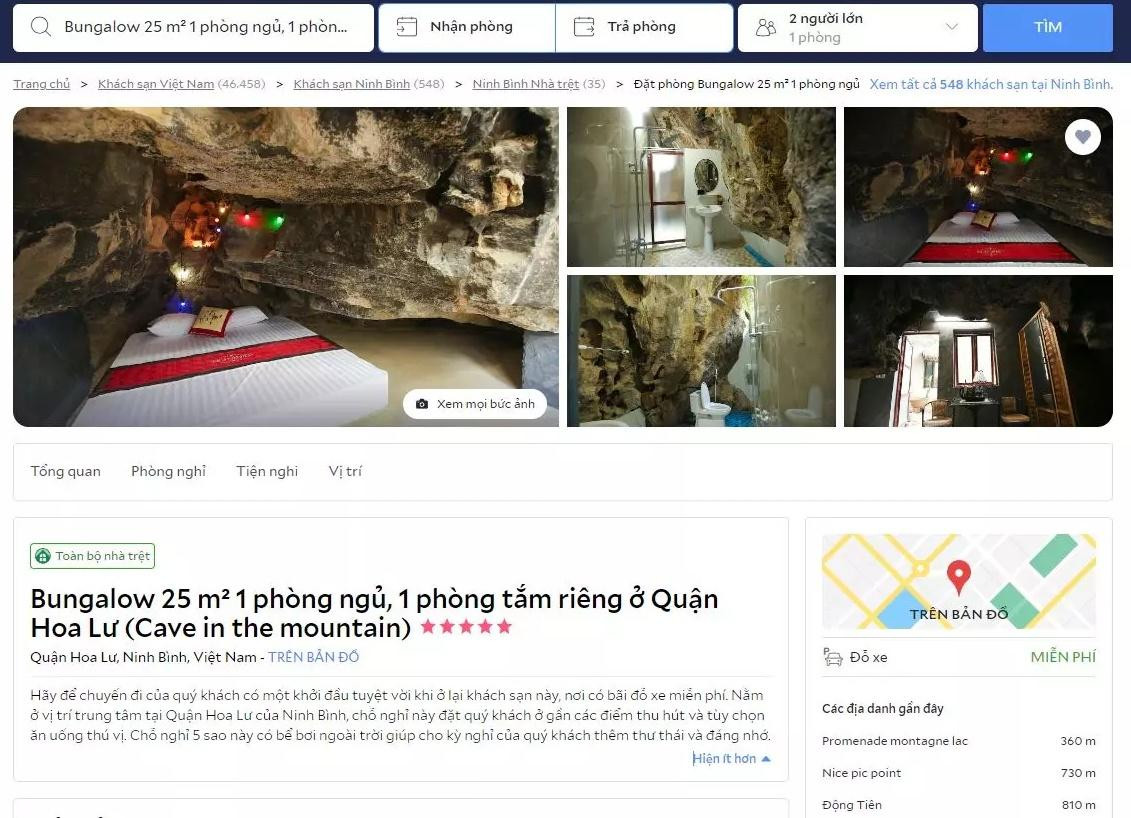 Trước đó, trên nền tảng đặt phòng nổi tiếng A. đăng thông tin về một phòng nghỉ trong hang núi tại huyện Hoa Lư (Ninh Bình), quảng cáo có giá hơn 60 triệu đồng/ đêm. Khách đặt phòng thanh toán tổng thuế, phí cho 1 đêm là hơn 74 triệu đồng với các lợi ích đi kèm như wifi miễn phí, bãi đỗ xe, bữa sáng, cà phê và trà...