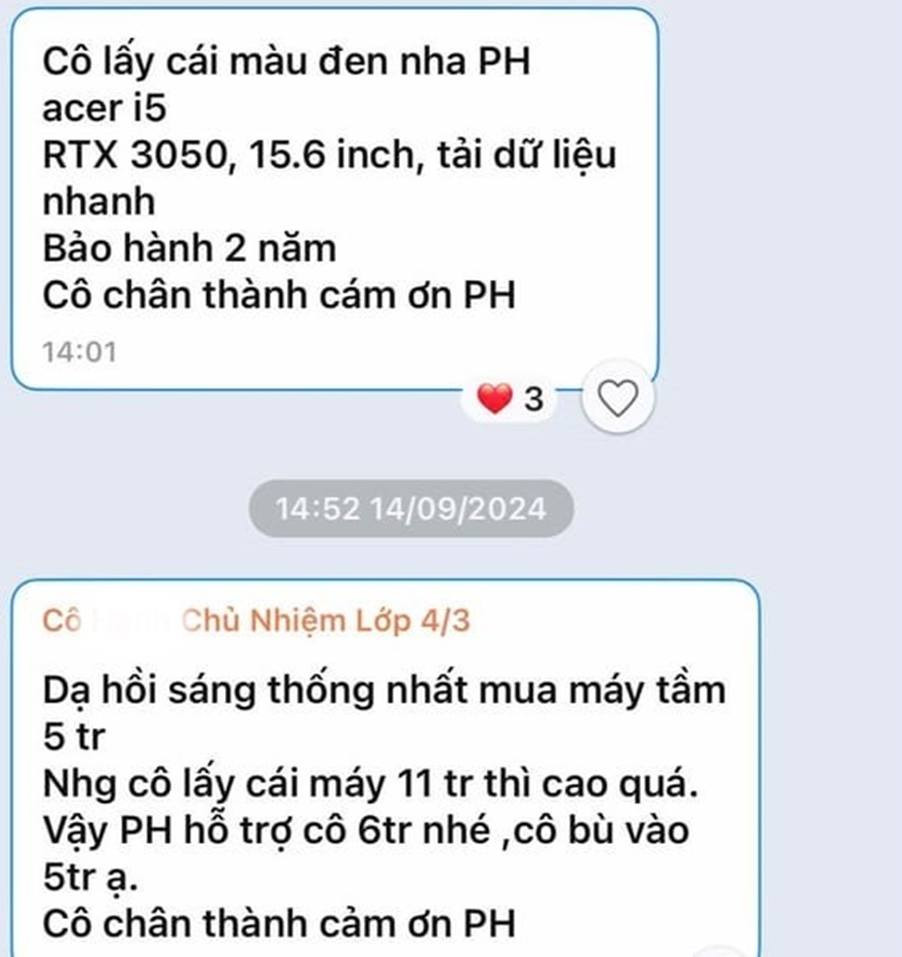 Ngày 16/9, cô H. tiếp tục nhắn tin tới phụ huynh trong lớp 4/3 với nội dung: "Hôm thứ Bảy (14/9), cô có xin phụ huynh hỗ trợ laptop khoảng 5 - 6 triệu đồng, và cô đã mua máy 11 triệu đồng, thì cô bù vào 5 triệu đồng và laptop này là của cô. Phụ huynh có đồng ý không ạ?".