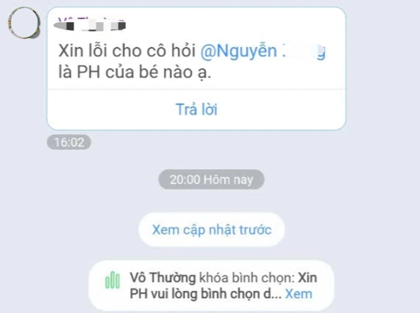 Cùng với tin nhắn trên, cô H. tạo bình chọn trên nhóm Zalo đồng ý/không đồng ý cho phụ huynh bỏ phiếu. Đáng nói, khi có phụ huynh nêu ý kiến không đồng ý, cô H. lập tức hỏi phụ huynh của bé nào rồi khóa bình chọn.
