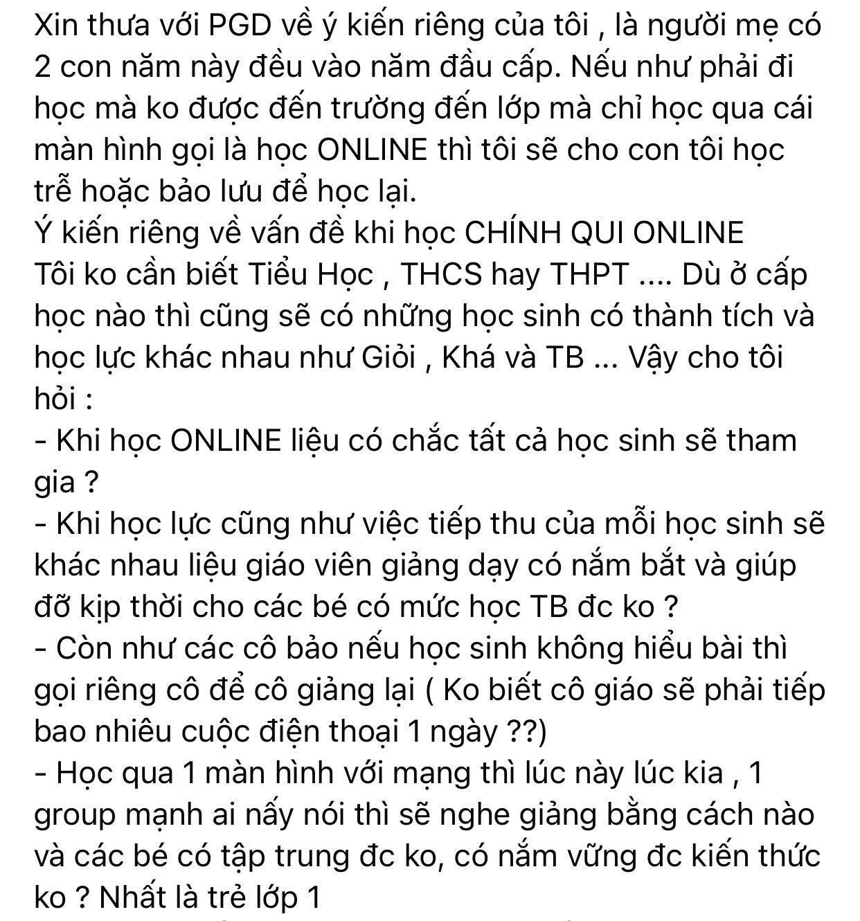 Phụ huynh này đã chỉ ra những bất cập khi học online như: Không đảm bảo tất cả học sinh sẽ tham gia, khả năng tiếp thu bài và học lực của mỗi học sinh khác nhau, giáo viên không kịp thời hỗ trợ, tình trạng mạng không ổn định, nhiễu loạn âm thanh gây mất tập trung, nhiều gia đình không đủ điều kiện kinh tế để trang bị thiết bị học cho con... Cuối bài viết, phụ huynh này bày tỏ mong muốn Phòng GD&ĐT dời thời gian nhập học đến khi dịch bệnh được kiểm soát.