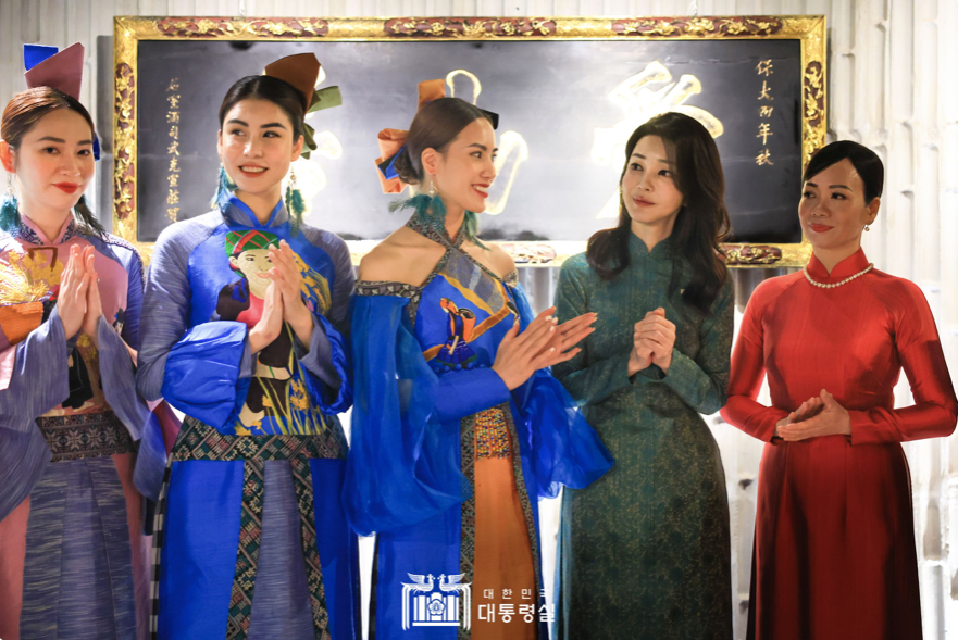 | Theo thông tin từ Văn phòng Tổng thống Hàn Quốc, hai Phu nhân cùng diện áo dài truyền thống của Việt Nam. Áo dài bà Kim Keon-hee mặc là món quà được phu nhân Chủ tịch nước Võ Văn Thưởng tặng. |
