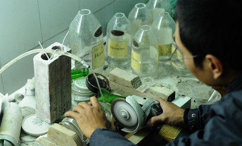 Anh Tâm chia sẻ rằng, thời gian đầu làm nghề này anh đem hết chai, lọ trong nhà rồi đi xin ở nhà bạn bè về để "thí nghiệm". Sau này, khi quyết định kinh doanh, anh Tâm đi nhặt và thu mua tại các nhà hàng, quán ăn. Các chai, lọ phế liệu sau khi mang về được anh Tâm làm sạch, sau đó "tạo dáng" để tiến hành cắt.