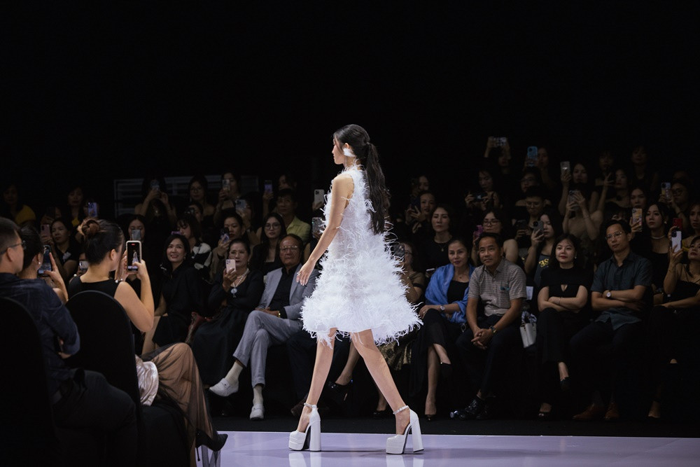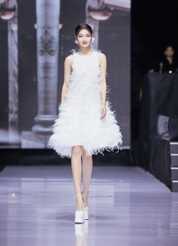 Như trong show diễn giới thiệu bộ sưu tập Thu Đông 2023 của Elise, Phương Nhi được khen xinh như công chúa tuyết với bộ váy ngắn đính lông vũ bồng bềnh. Thiết kế này vốn khá kén người mặc nhưng lại rất hợp với vẻ đẹp thanh thuần, trong veo của Phương Nhi.