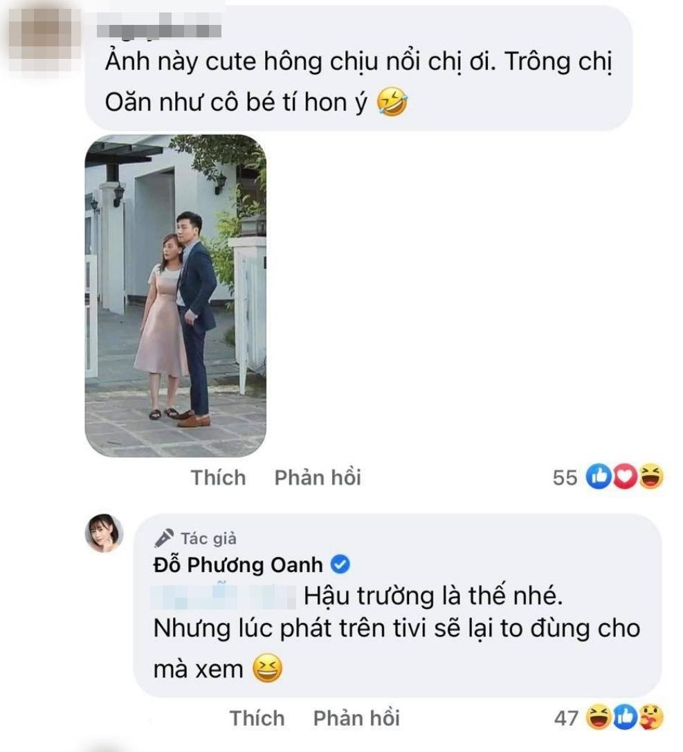 Trong đoạn cuối của tập phim mới nhất có khung hình Phương Oanh nhìn đầy nhỏ bé khi đứng cạnh Mạnh Trường. Có khán giả thấy nữ diễn viên nhìn quá dễ thương đã để lại bình luận khen ngợi “Ảnh này dễ thương không chịu nổi chị ơi. Trông chị Oanh như cô bé tí hon ý!".