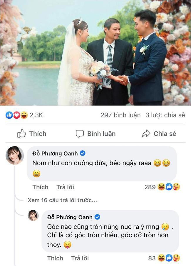 Một lần khác, khi khán giả soi ra Phương Oanh bị lộ "bé mỡ" khi mặc váy cưới trong cảnh kết hôn với "Shark" Long Mạnh Trường thì nữ diễn viên thích thú tự nhận mình giống như... con đuông dừa, lên hình thì góc nào cũng tròn.