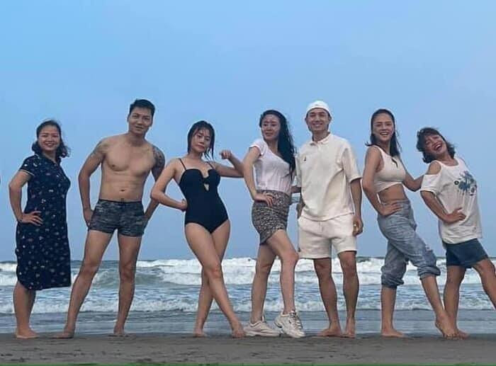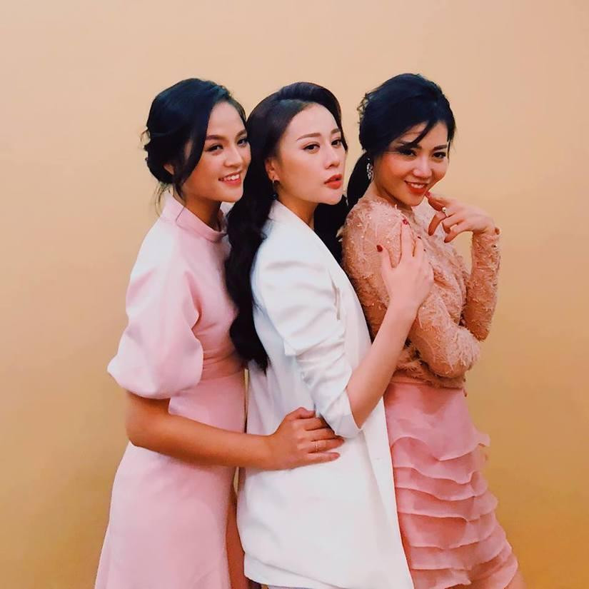Ngay cả khi không diện trang phục "dìm dáng" thì Phương Oanh cũng bị thấp đi một cách khó hiểu khi lên hình. Chẳng hạn trong bức ảnh hậu trường này, ai cũng thấy Phương Oanh dường như là người thấp nhất đội hình, ngang với diễn viên Tú Oanh (vai bà Bích).