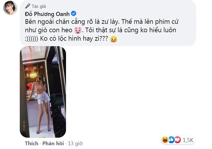 Chính Phương Oanh cũng lấy làm khó hiểu trước việc mình bỗng dưng trông mũm mĩm khi lên hình. Cô đăng tải bức ảnh selfie khoe đôi chân thon thả với lời than thở "Bên ngoài chân cẳng rõ là như này. Thế mà lên phim cứ như giò con heo. Tôi thật sự là cũng không hiểu luôn. Không có lộc hình hay gì?".