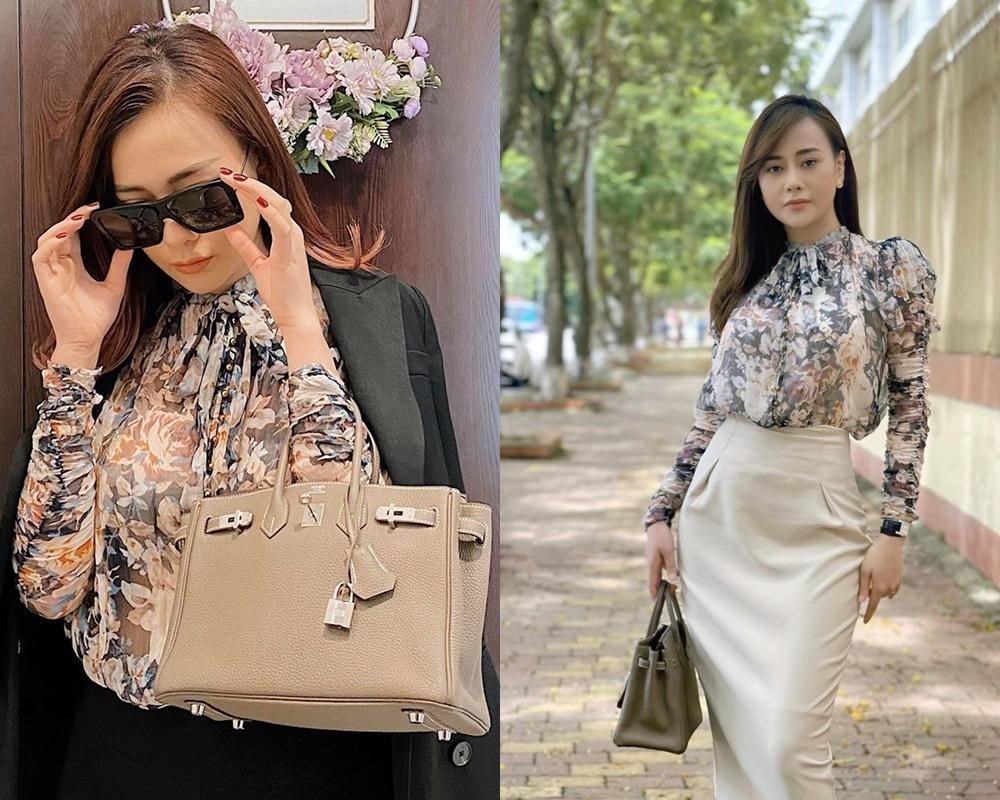 Lại thêm một mẫu áo điệu đà được Phương Oanh tái sử dụng để có diện mạo sành điệu, sang chảnh đúng chuẩn con nhà giàu. Thậm chí hai chiếc túi Hermès xịn xò cũng có kiểu dáng tương đồng, chỉ khác về màu sắc.