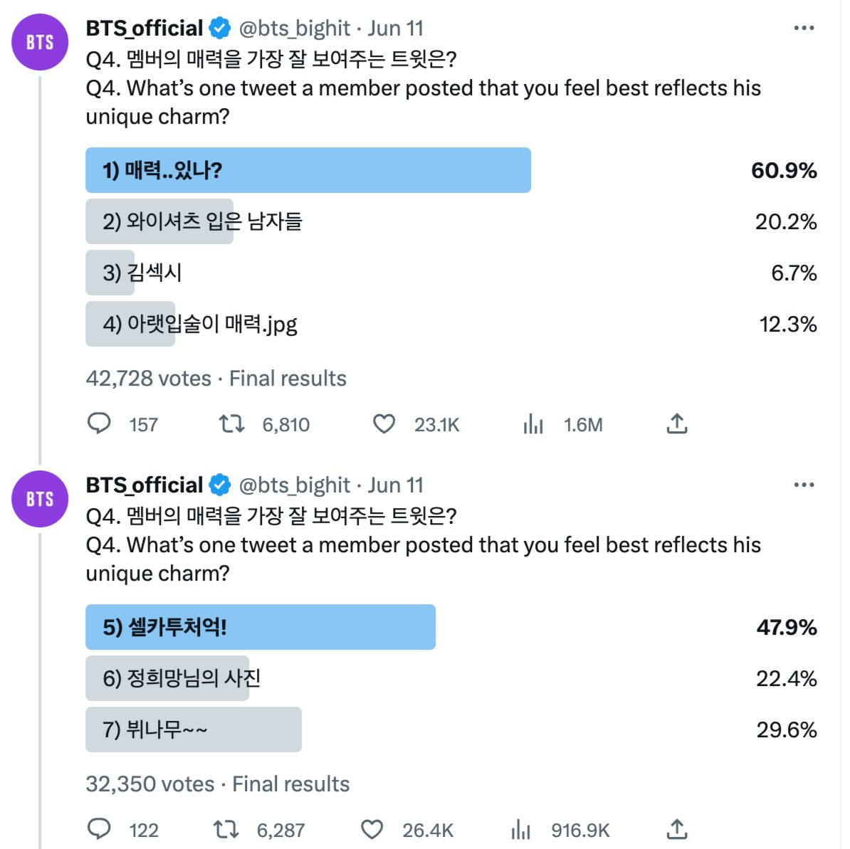 Thuộc khuôn khổ FESTA 2023 kỷ niệm 10 ra mắt của BTS, tài khoản Twitter của BTS đã mở một cuộc bình chọn cho người hâm mộ với tên gọi 10 Years on Twitter - 5 Questions. Tại đây mỗi thành viên BTS cũng đưa ra câu trả lời riêng cho từng câu hỏi. Trong đó, câu hỏi "Một tweet được các thành viên đăng mà bạn cảm thấy quyến rũ nhất?" nhận được đông đảo sự chú ý từ người hâm mộ.