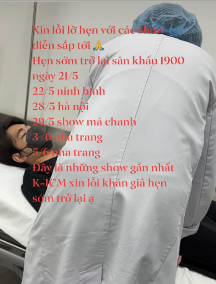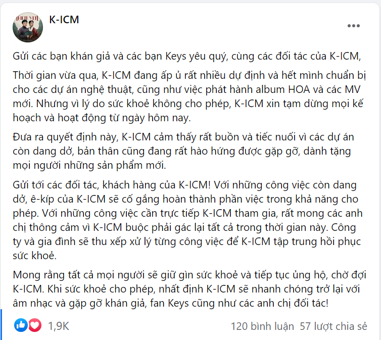 Trước đó, trên trang cá nhân của mình, K-ICM cũng đã đăng tâm thư xin lỗi khán giả, đối tác cũng như các nhãn hàng vì tình hình sức khỏe không tốt. Cụ thể, K-ICM cho biết thời gian vừa qua, anh đã ấp ủ nhiều dự định và đang hết mình chuẩn bị cho các dự án nghệ thuật cũng như việc phát hành album đầu tay và các MV mới. Tuy nhiên vì lý do sức khoẻ không cho phép, anh chàng đã xin tạm dừng mọi kế hoạch và hoạt động.