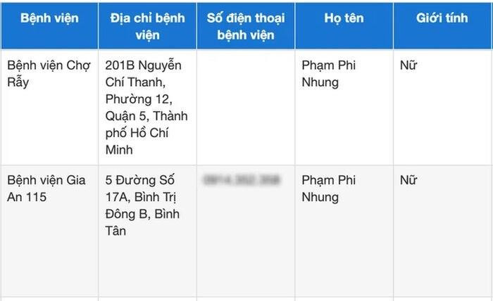 Hiện tại, trên website hệ thống quản lý người cách ly và người nhiễm COVID-19 tại TP.HCM đã cập nhật thông tin bệnh nhân Phạm Phi Nhung (tên đầy đủ của ca sĩ Phi Nhung), sinh năm 1970 và có địa chỉ nhà tại quận Bình Thạnh, đã được điều trị tại Bệnh viện Gia An và Bệnh viện Chợ Rẫy.