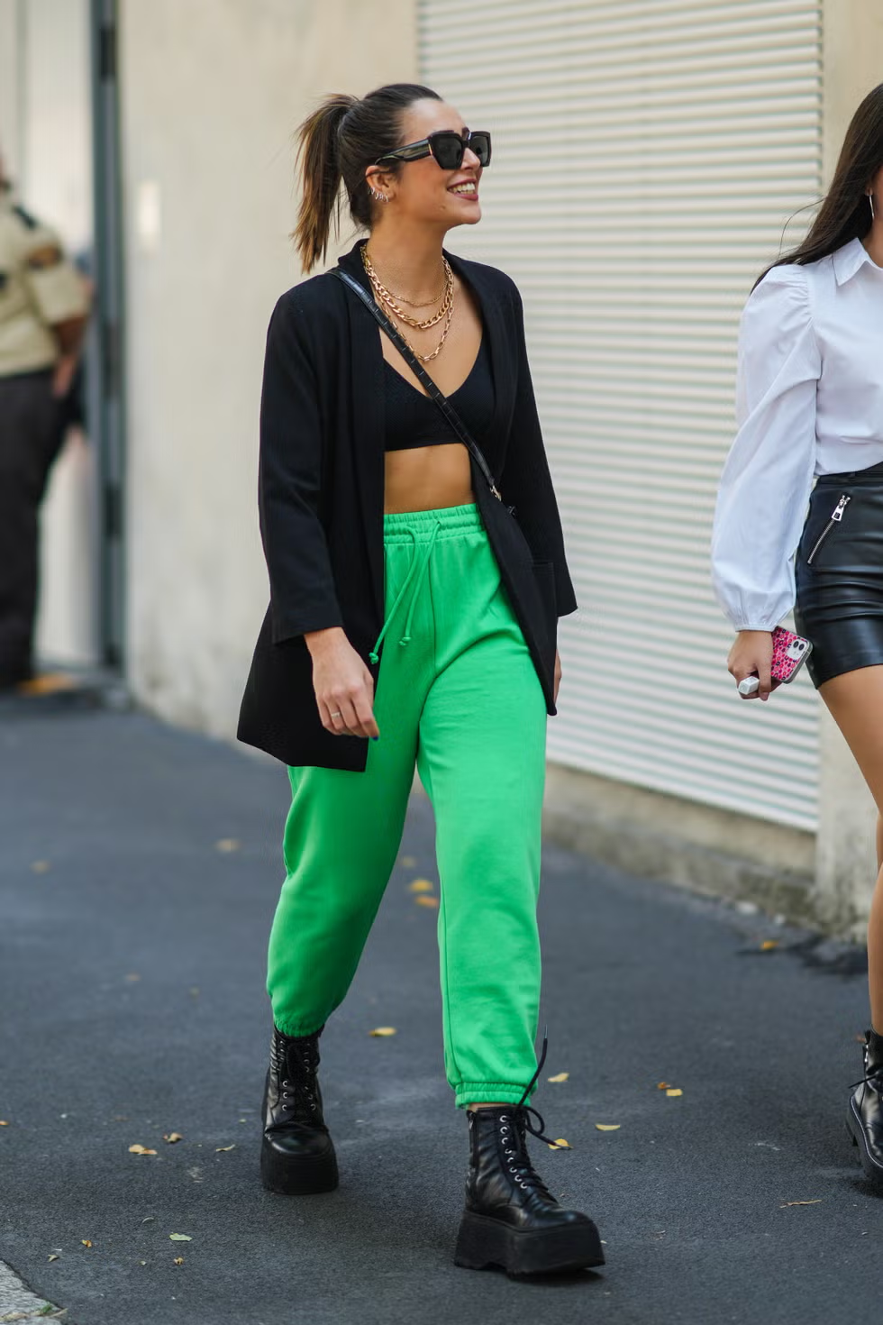 Áo khoác blazer, đeo kính râm, vòng cổ gold chain, túi đeo chéo họa tiết da cá sấu và quần thể thao cạp cao màu xanh neon dài, mang cùng bốt da cột dây cao đến mắt cá chân. Còn gì thời thượng hơn bản phối này được nữa.