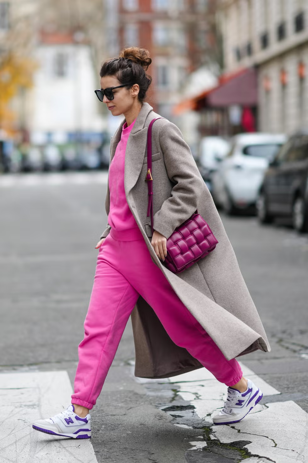 Phối đồ đồng bộ là một gợi ý đơn giản và hiệu quả để mặc sweat pants. Nên chọn bộ sáng màu, khoác thêm áo khoác sang trọng và mang đôi giày thể thao để nhấn mạnh cảm giác thoải mái, tự do.