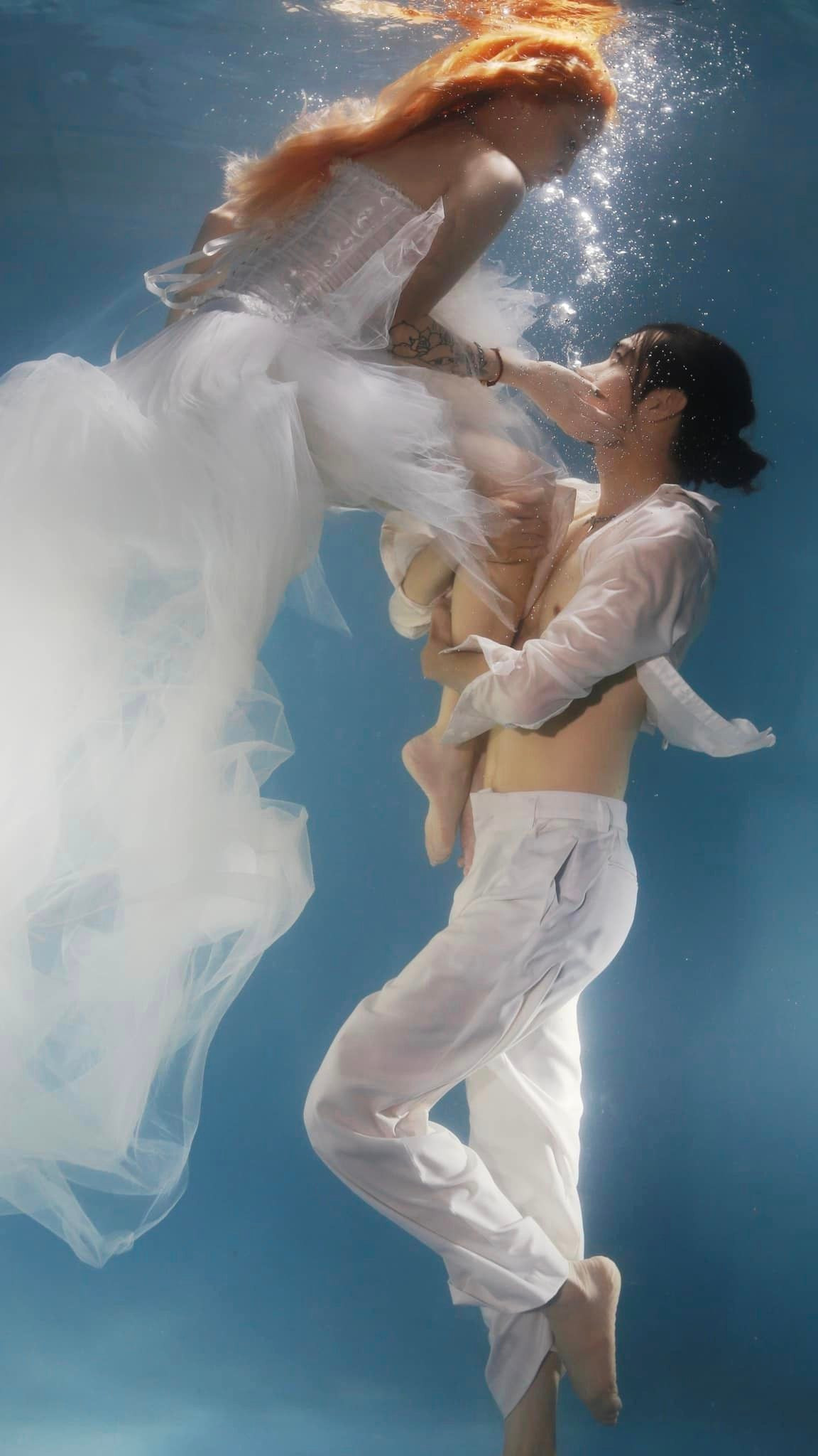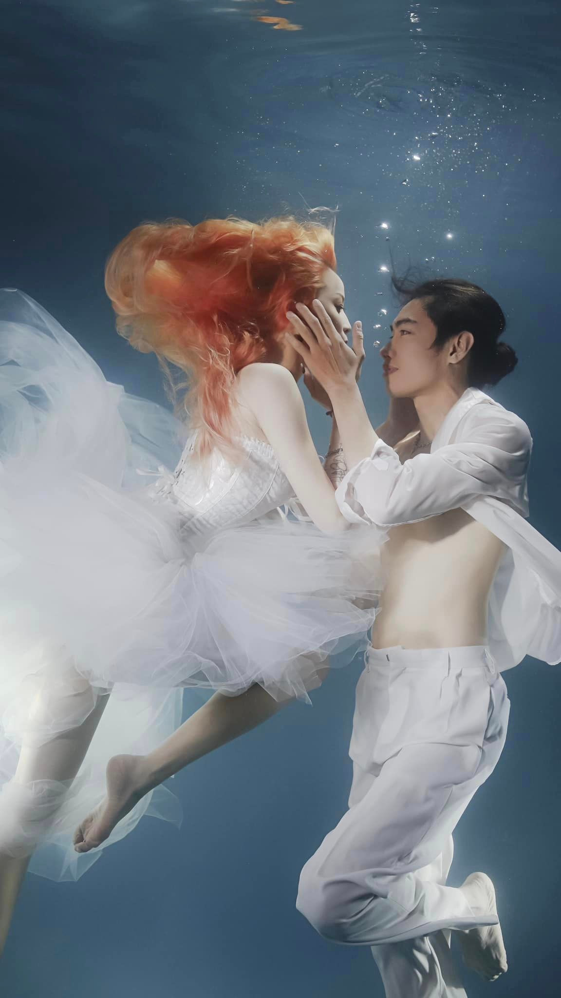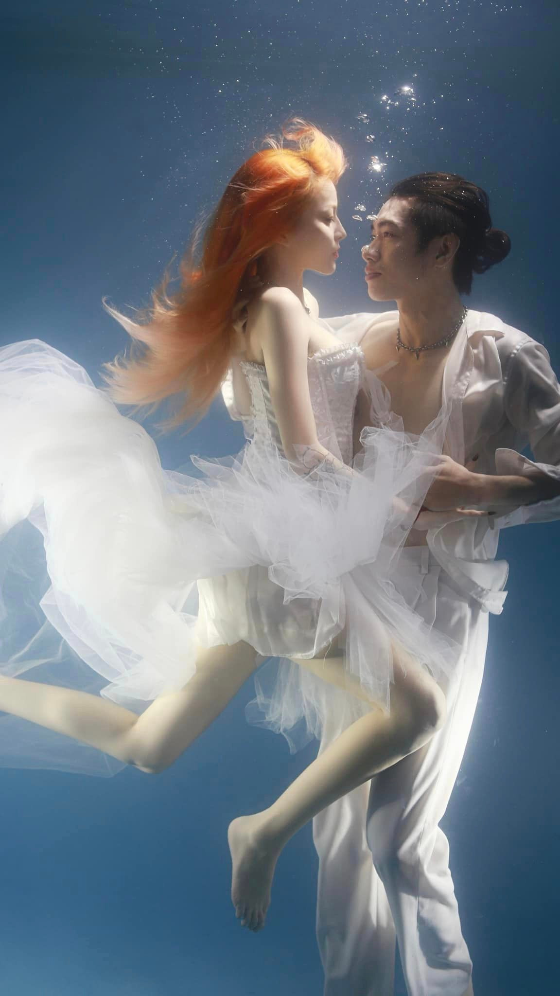 Đều là những vũ công, biên đạo chuyên nghiệp và sở hữu hình thể đẹp, Quang Đăng và bạn gái Yee Pink. Bộ đôi diện trang phục trắng và thể hiện những điệu nhảy uyển chuyển dưới nước. Trong khi Quang Đăng mặc áo sơ mi trắng thì Yee Pink diện một chiếc váy ôm sát khoe trọn đường cong đính kèm voan cưới thướt tha trên đầu.