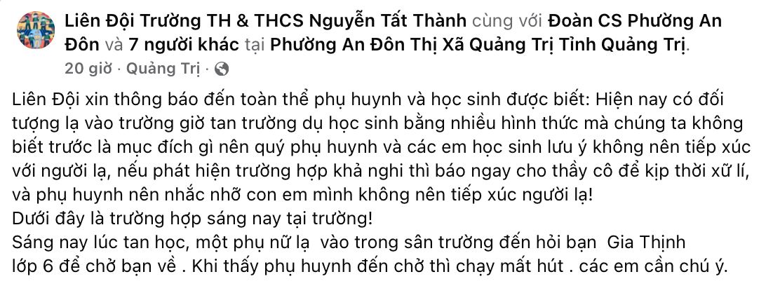Trước đó, cuối giờ học ngày 4/2, một phụ nữ lạ mặt đến khu vực cổng trường Tiểu học và THCS Nguyễn Tất Thành (phường An Đôn, thị xã Quảng Trị, Quảng Trị) hỏi tên em P.G.T. (học sinh lớp 6) để đón về. Tuy nhiên, khi thấy phụ huynh em T. đến, người này lập tức rời đi.
