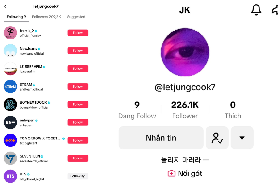 Tối 1/8, Jung Kook (BTS) đã chia sẻ một liên kết TikTok về video thực hiện dance challenge Seven của Jungwon và Jay (ENHYPEN). Vốn dĩ mọi việc sẽ không đáng nói nếu như đường link này không hiển thị ID tài khoản chia sẻ.