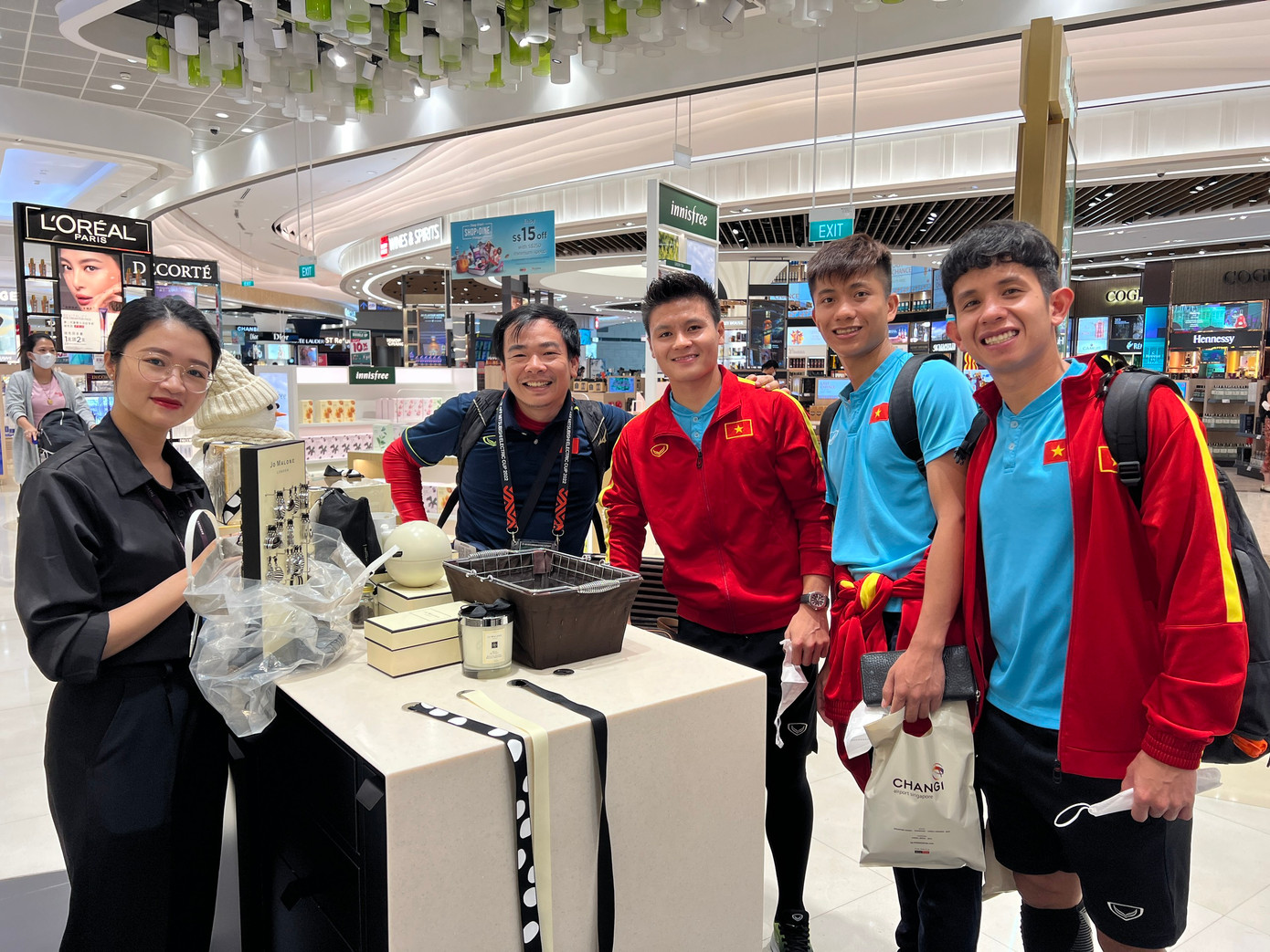 | Thành viên BHL đội tuyển Việt Nam tươi tắn tại sân bay Changi (ảnh Hữu Phạm) |