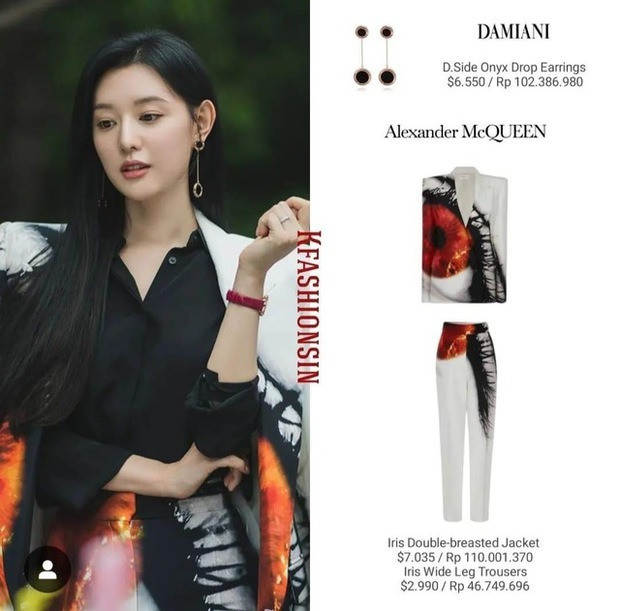 Nhiều người cứ ngỡ nhan sắc đẹp thanh tao như Kim Ji Won không hợp với các thiết kế độc đáo ấn tượng, nhưng bộ suit với họa tiết lạ mắt của Alexander McQUEEN hóa ra càng giúp cô thêm phần kiêu kỳ. Set đồ Kim Ji Won mặc trị giá 240 triệu đồng còn đôi khuyên tai thì xấp xỉ 160 triệu đồng.