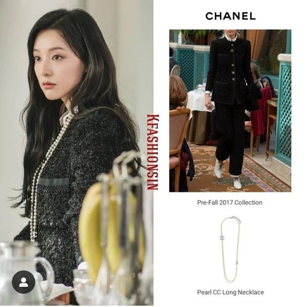 Nữ tổng tài Hae In của Queen of Tears xem chừng là tín đồ màu đen khi thường xuyên mặc trang phục đen. Mẫu áo dạ này vốn thuộc bộ sưu tập của Chanel từ năm 2017 nhưng đến giờ vẫn rất thời thượng và Kim Ji Won kết hợp với vòng cổ ngọc trai cho thêm phần quý phái.
