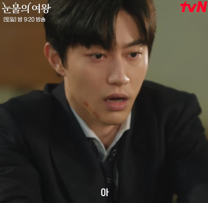 | Hyun Woo nhận thấy bất ổn nên lập tức trấn an: "Cô ấy không làm thế với con đâu ạ". |