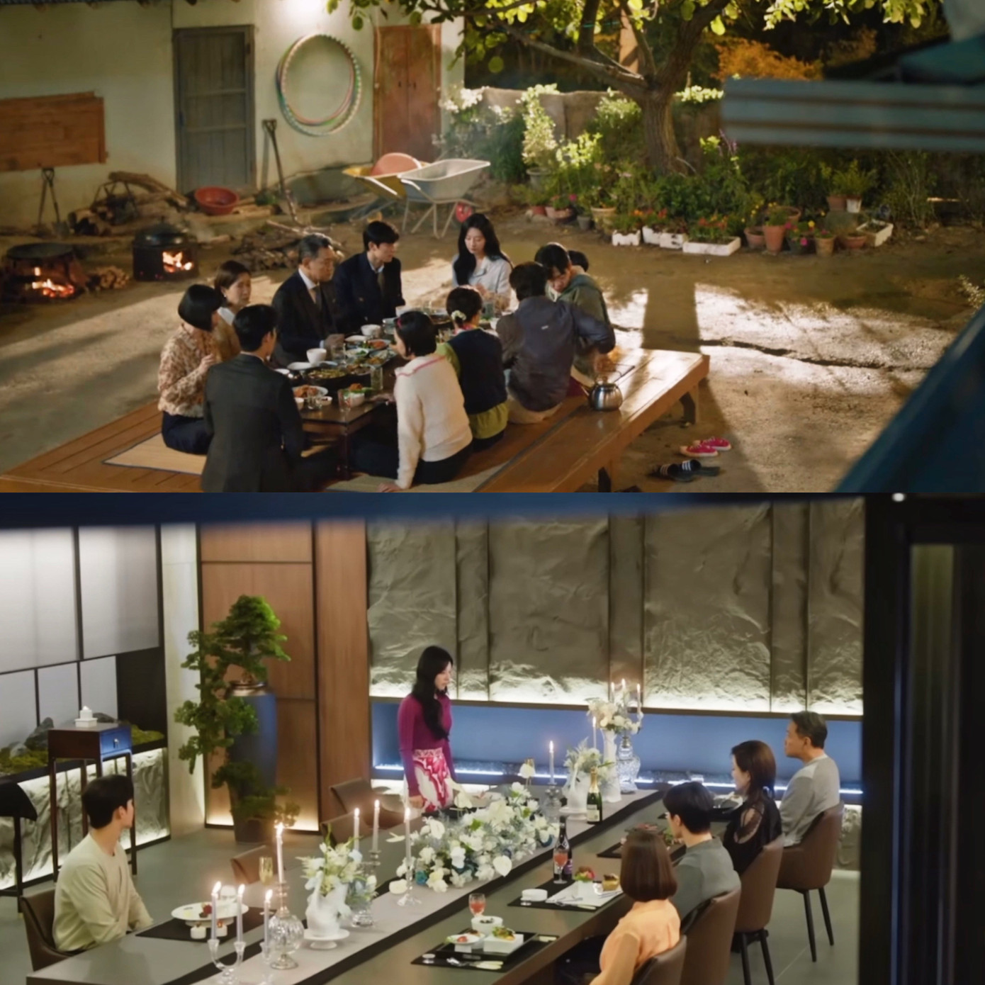 Khung cảnh ở nhà Hyun Woo thì ngược lại, hai bên gia đình ngồi sát nhau cùng ăn cơm trên 1 chiếc bàn có lẽ chỉ bằng 1/4 chiếc bàn ăn nhà Hae In. Nó đông đúc và ấm áp hơn. Hae In và Hyun Woo ngồi ở hai đầu bàn, vị trí như tượng trưng cho việc cả hai sẽ là trụ cột của hai gia đình, cũng là người chèo lái qua cơn sóng gió này.