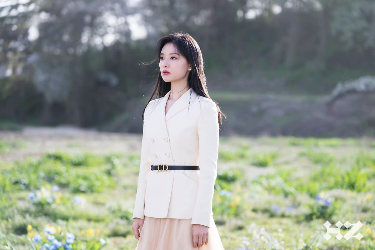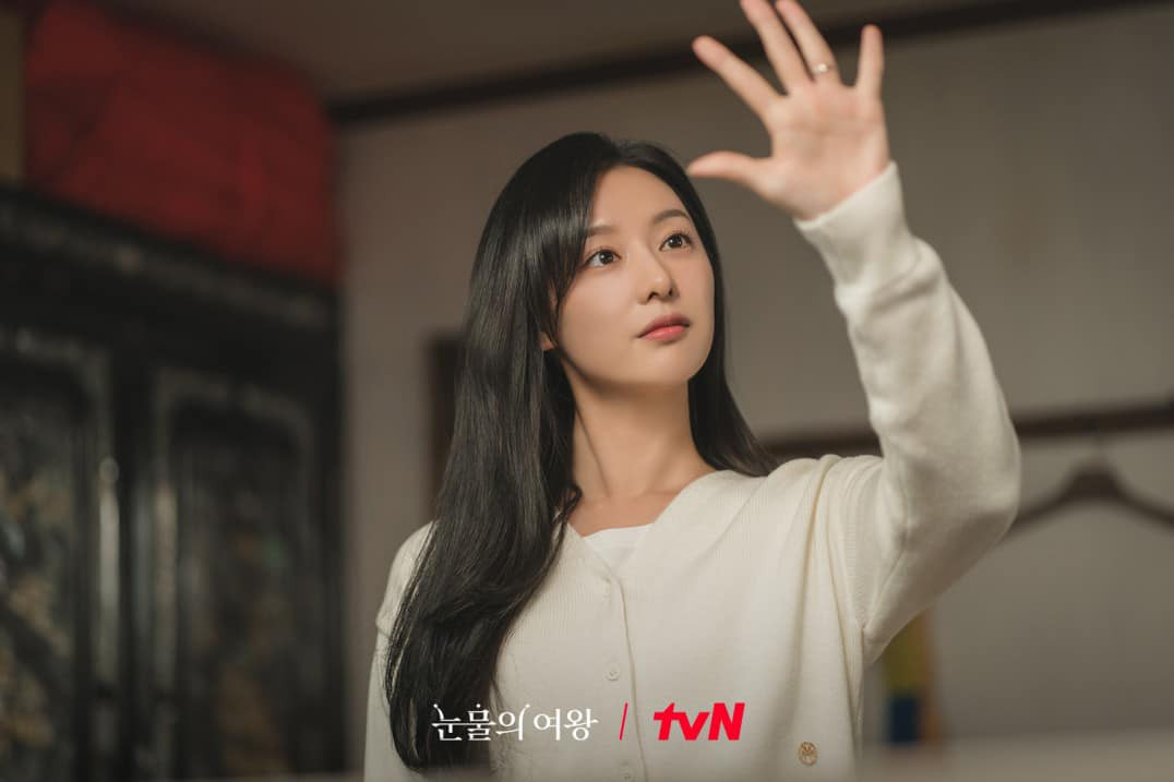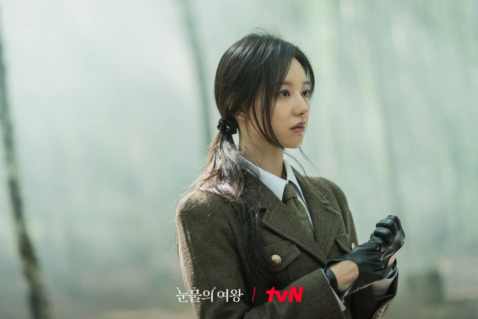 Suốt phim Queen Of Tears, nữ chính Hong Hae In thay đổi đến hàng trăm bộ đồ đắt giá với nhiều kiểu dáng màu sắc nhưng lại chỉ để một kiểu tóc. Cô thích buông tóc xõa, có thể để suôn thẳng hay uốn xoăn nhẹ và kéo một phần tóc bên phải ra phía trước vai.
