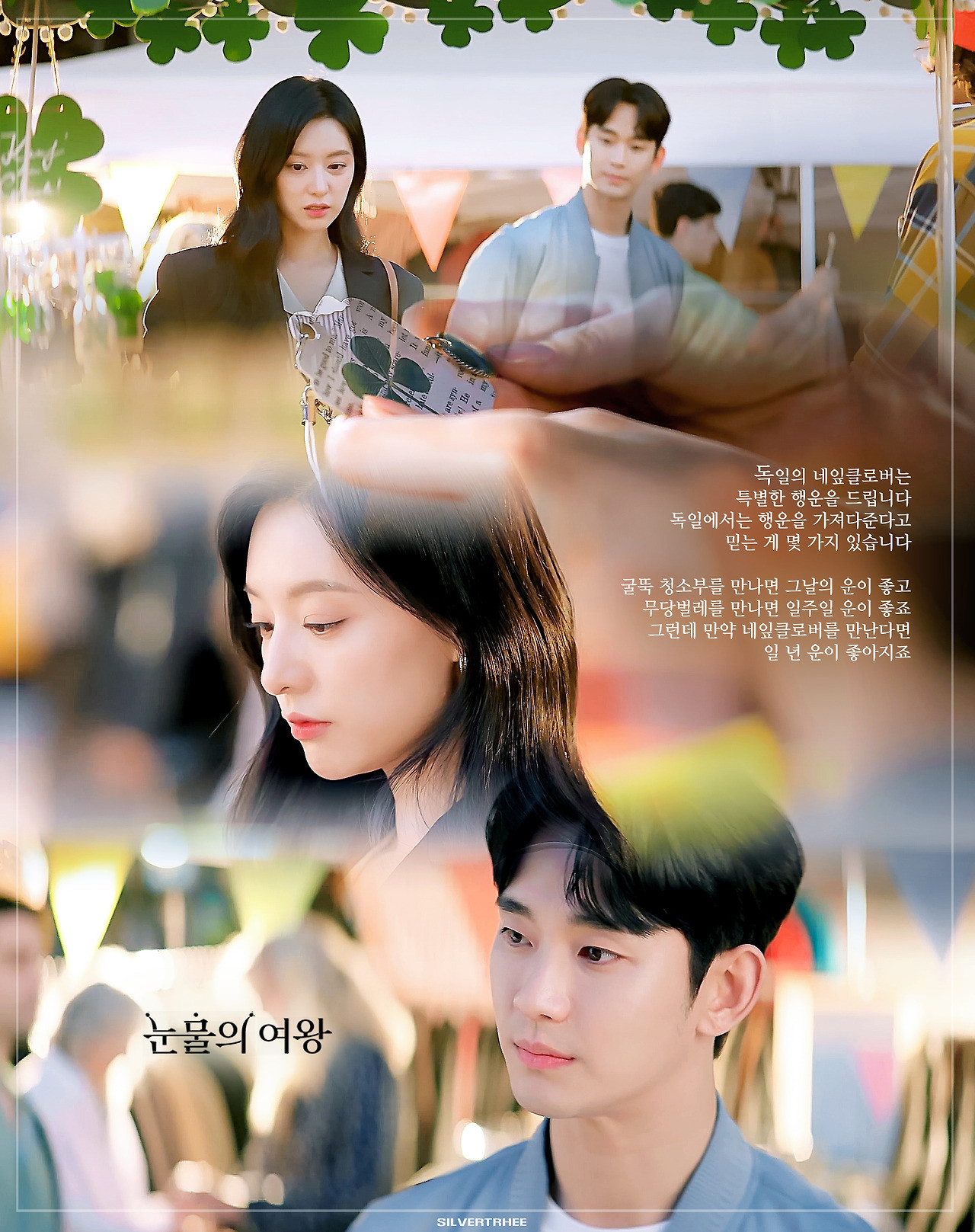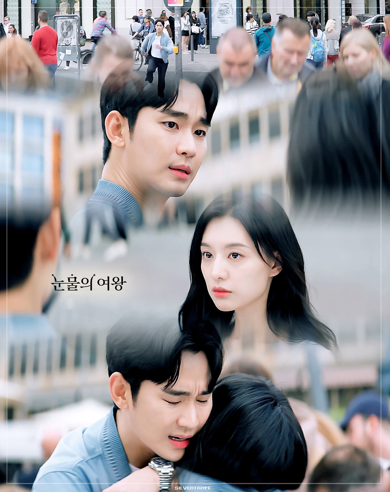 Đầu tập 6 của Queen of Tears là thời gian ngắn ngủi tại Đức gương vỡ lại lành của Hae In (Kim Ji Won) và Hyun Woo (Kim Soo Hyun). Khi cuối cùng, Hong Hae In chọn để lộ tất thảy những yếu đuối nhất sâu thẳm trong cô trước mặt Hyun Woo. Cô nói rõ chuyện lập di chúc tiền hôn nhân không để lại bất kỳ tài sản nào cho anh. Đó là cách cô qua mắt mẹ, để bà dự đám cưới và chúc phúc cho hai người. Hae In khẳng định cô sẽ sửa lại di chúc.