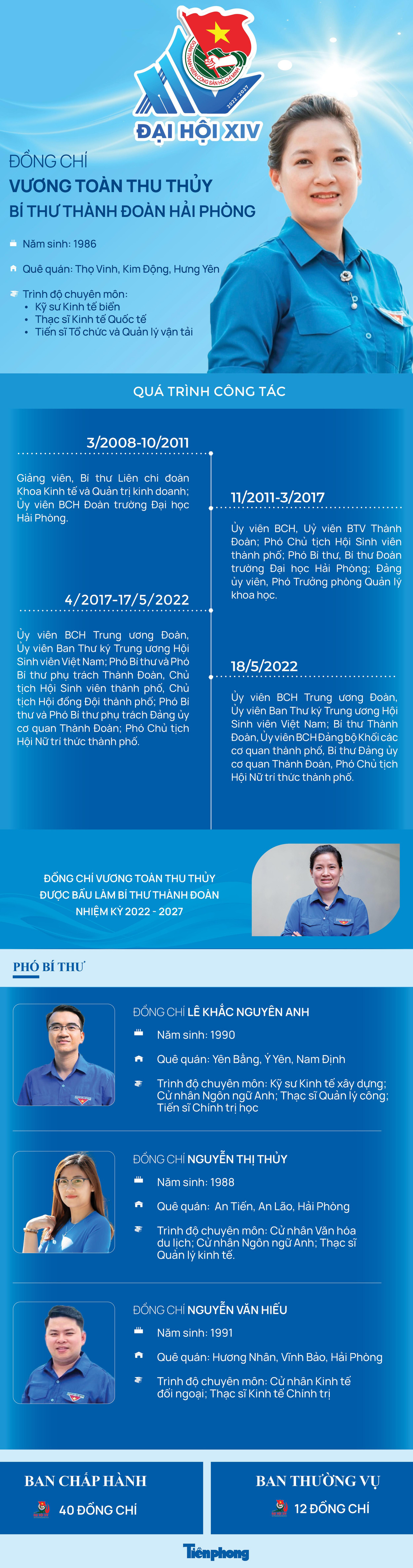 TPO - Đại hội đại biểu Đoàn TNCS Hồ Chí Minh TP Hải Phòng khóa XIV, nhiệm kỳ 2022-2027 đã bầu 40 anh, chị vào Ban chấp hành khóa mới; Ban thường vụ 12 anh, chị. Trong đó, chị Vương Toàn Thu Thủy tái đắc cử Bí thư Thành Đoàn Hải Phòng, 3 Phó Bí thư là anh Lê Khắc Nguyên Anh, chị Nguyễn Thị Thủy và anh Nguyễn Văn Hiếu.