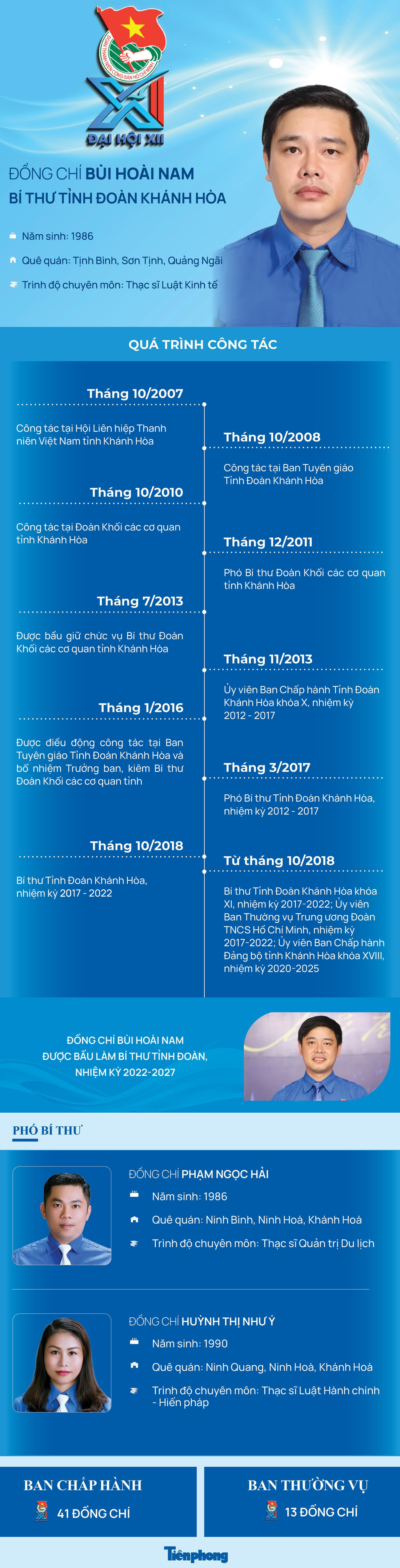TPO - Đại hội đại biểu Đoàn Thanh niên Cộng sản Hồ Chí Minh tỉnh Khánh Hòa khóa XII, nhiệm kỳ 2022-2027, đã bầu ra Ban Chấp hành khóa mới gồm 41 anh, chị; Ban Thường vụ 13 anh, chị. Trong đó, anh Bùi Hoài Nam là Bí thư Đoàn TNCS Hồ Chí Minh tỉnh Khánh Hòa khóa XII, 2 Phó Bí thư là anh Phạm Ngọc Hải và chị Huỳnh Thị Như Ý.