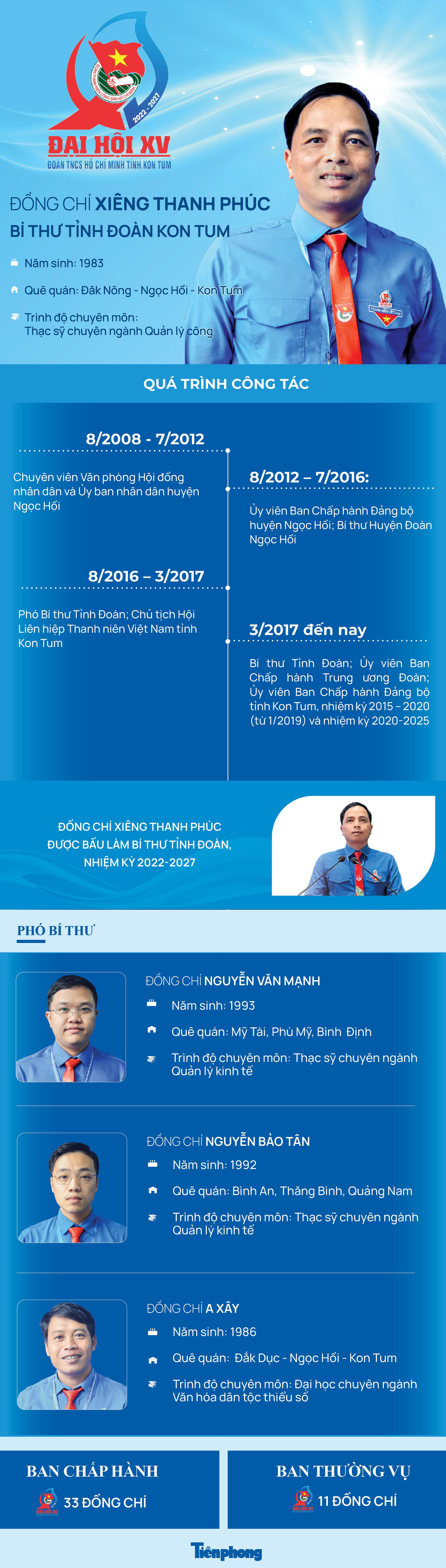 TPO - Tại Đại hội đại biểu Đoàn TNCS Hồ Chí Minh tỉnh Kon Tum lần thứ XV, nhiệm kỳ 2022–2027, đã bầu 33 anh, chị vào Ban Chấp hành Tỉnh Đoàn khóa XV, 11 anh, chị vào Ban Thường vụ Tỉnh Đoàn. Tại hội nghị lần thứ nhất Ban Chấp hành Tỉnh Đoàn Kon Tum, anh Xiêng Thanh Phúc tái đắc cử Bí thư Tỉnh Đoàn; các anh: A Xây, Nguyễn Văn Mạnh và Nguyễn Bảo Tân tái đắc cử chức Phó Bí thư Tỉnh Đoàn Kon Tum khóa XV, nhiệm kỳ 2022 - 2027.
