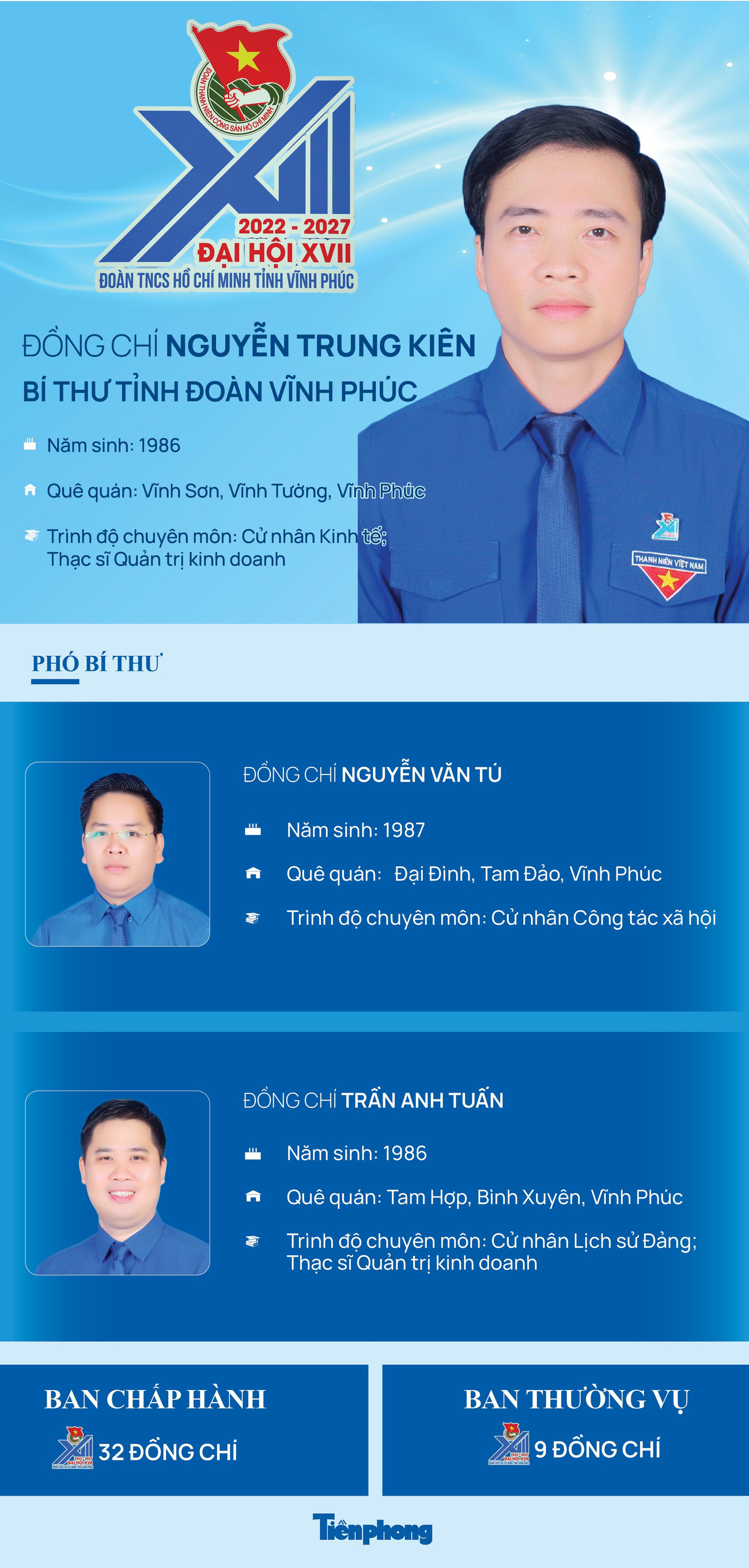 TPO - Chiều 28/9, Hội nghị lần thứ nhất Ban Chấp hành Tỉnh Đoàn Vĩnh Phúc khóa XVII, nhiệm kỳ 2022 - 2027, đã diễn ra. Anh Nguyễn Trung Kiên được bầu làm Bí thư Tỉnh Đoàn Vĩnh Phúc khóa XVII. Hai Phó Bí thư Tỉnh Đoàn là anh Nguyễn Văn Tú và anh Trần Anh Tuấn.