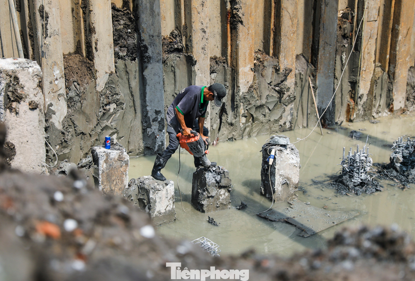 | Thời tiết tại TPHCM trong những ngày qua mưa lớn liên tiếp khiến công trình bị ảnh hưởng. Công nhân vừa làm vừa bơm nước ra để kịp tiến độ. |