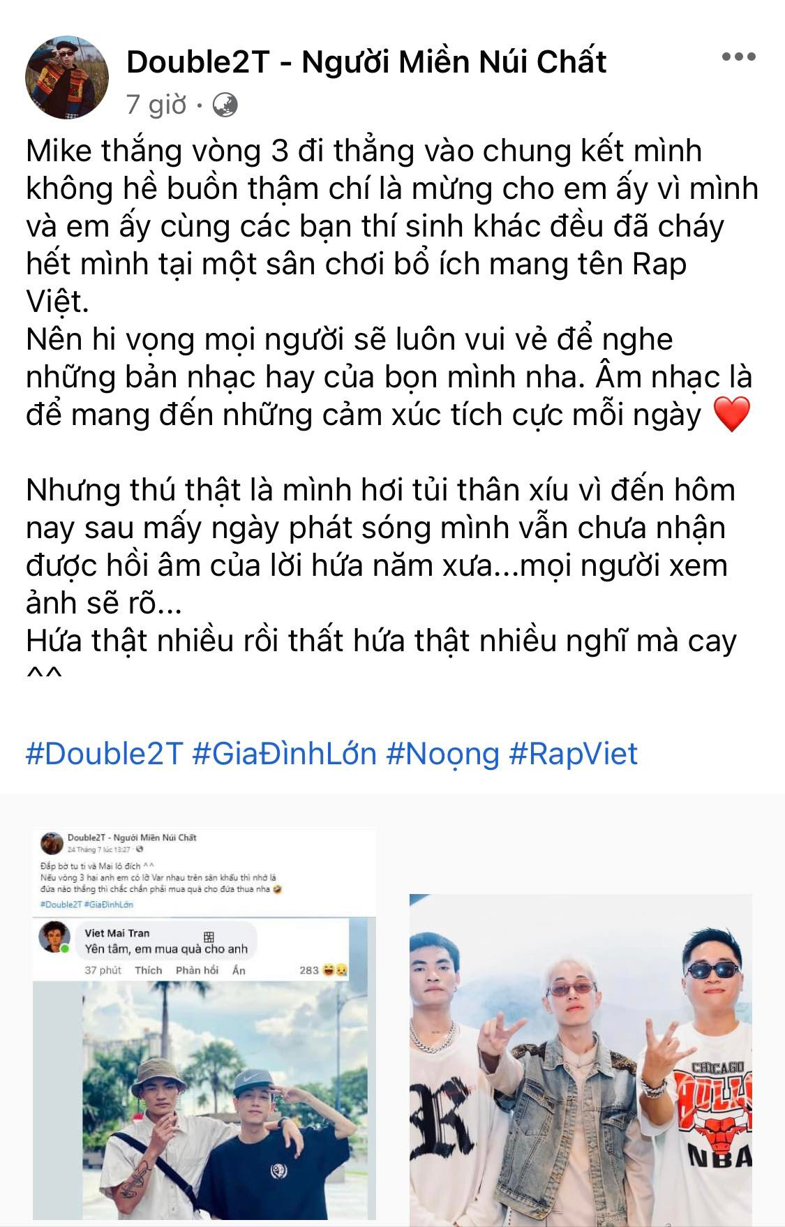 Giữa những tranh cãi hướng về đàn em, Double2T đã lên tiếng bảo vệ Mikelodic: "Mike đã thắng vòng 3 và đi thẳng vào Chung kết. Mình không hề thấy buồn mà thậm chí là mừng cho em ấy... Hy vọng mọi người sẽ luôn vui vẻ để nghe những bản nhạc hay của bọn mình nha". Hành động này của rapper À Lôi cũng ngầm khẳng định mối quan hệ thân thiết giữa các thí sinh đồng thời giúp anh nhận về nhiều lời khen của netizen.