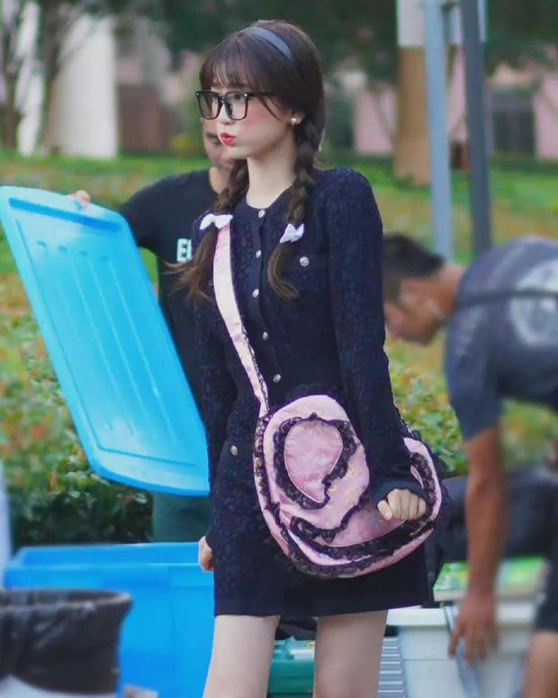Mới đây, netizen phát hiện Ngu Thư Hân đang ghi hình với diện mạo trẻ trung như nữ sinh. Cô nàng diện một mẫu váy len ôm sát, tóc tên đuôi sam và đeo một chiếc túi hồng hình trái tim bánh bèo.