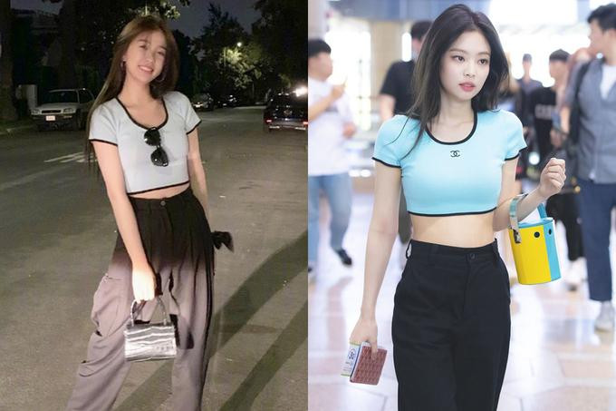 Ngu Thư Hân cũng có lần copy nguyên set đồ quần ống rộng đen và áo crop-top xanh mà Jennie từng diện ra sân bay. Nhưng lần này thì khoảng hở eo quá ít nên không khoe được vòng eo đẹp như Jennie.