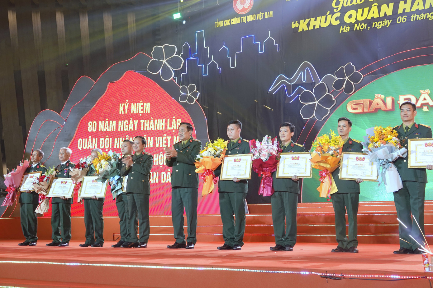 | Chủ nhiệm Tổng cục Chính trị QĐND Việt Nam Trịnh Văn Quyết và Thứ trưởng Bộ Quốc phòng Võ Minh Lương trao giải Đặc biệt Cuộc thi tìm hiểu 80 năm Ngày thành lập QĐND Việt Nam và 35 năm Ngày hội Quốc phòng toàn dân tặng hai nhóm tác giả. |