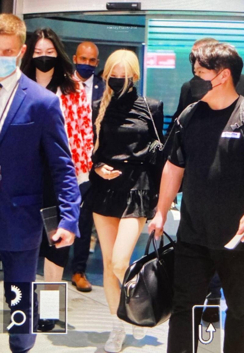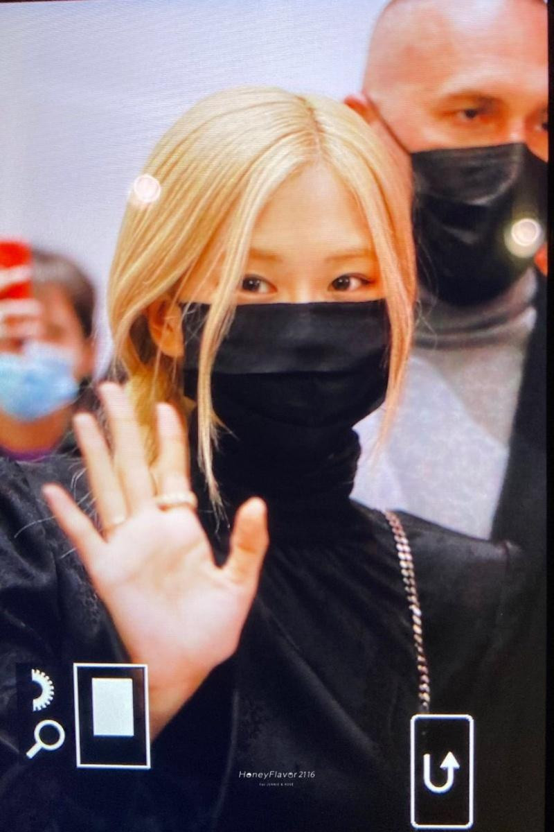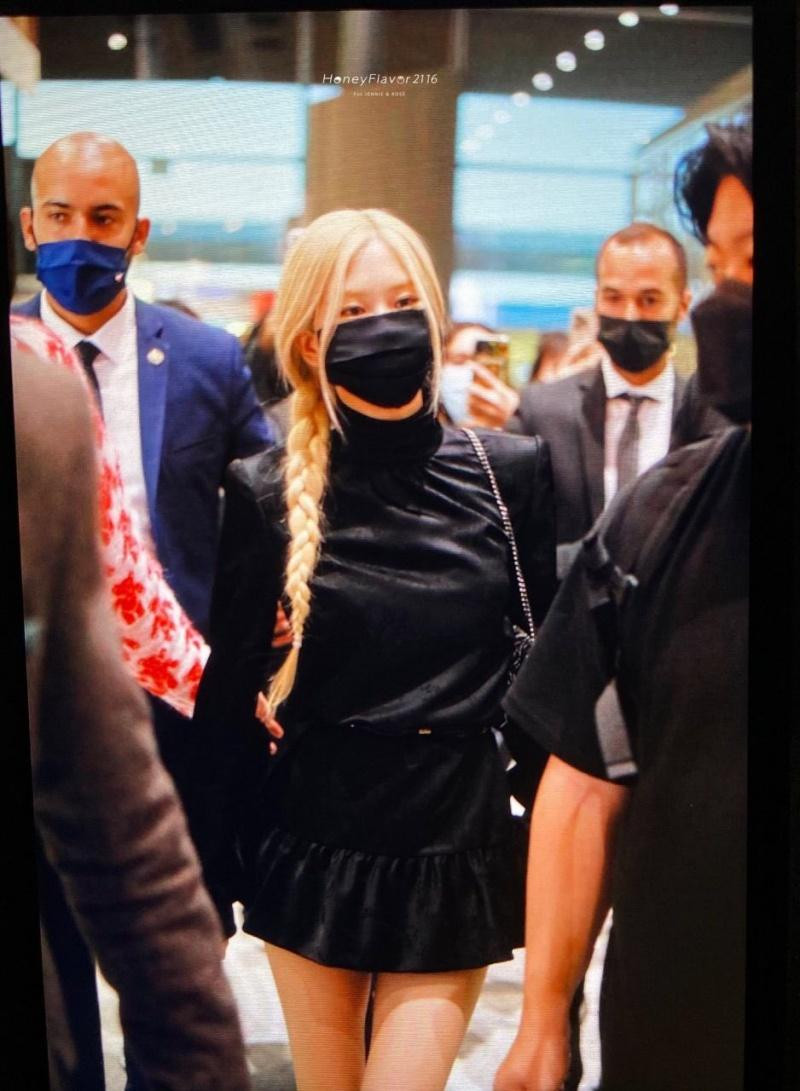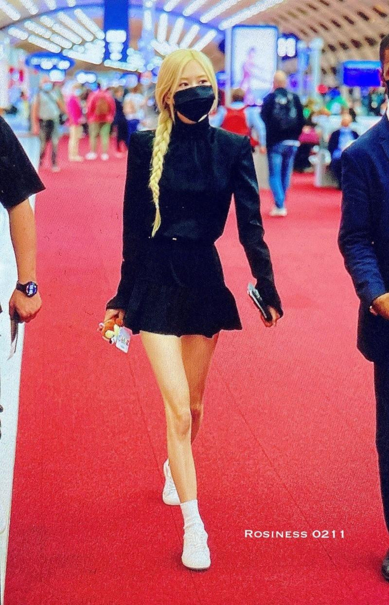 Xuất hiện ở sân bay trong loạt ảnh chụp của “team qua đường", Rosé BLACKPINK mặc dù đeo khẩu trang che mất 1/2 khuôn mặt vẫn khiến người xem cảm nhận được sự xinh đẹp rạng ngời. Nữ idol tiếp tục mặc thiết kế màu đen cao cổ, dài tay, váy khá ngắn, khoe trọn đôi chân dài.